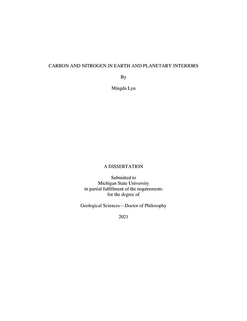 Volatile elements, such as carbon (C) and nitrogen (N), play an essential role on Earth in forming living organisms, maintaining a habitable climate, tracing geological processes, and powering the core dynamo. Constraining the distribution and budgets of volatile elements on terrestrial planets, such as the Earth and Mars, holds the key to understanding their formation, evolution, dynamics, and habitability. In this dissertation, I performed a series of experiments to investigate the physical properties and chemical behavior of carbonates and iron nitrides at high pressure and temperature conditions to decipher the role of carbon and nitrogen in the Earth and planetary deep interior.The circulation of carbon between reservoirs on Earth’s surface and interior is the key to governing long-term atmospheric CO2 budget. Carbonates, including calcite (CaCO3), magnesite (MgCO3), and dolomite (CaMg(CO3)2, are believed to be the major carriers to transport surface carbon to the Earth’s mantle at subduction zones. However, the global carbon flux to the convecting lower mantle and the stable format of carbon at mantle conditions remain largely uncertain, due to lack of constraints on thermodynamic properties of subducted carbonates and limited understanding of the fate of carbonates through subduction. In chapter 2, I measured the thermal equation of state of CaCO3-Pmmn, a stable polymorph of CaCO3 through much of the lower mantle, using synchrotron X‐ray diffraction in a laser-heated diamond-anvil cell up to 75 GPa and 2200 K. Using the newly determined thermodynamic parameters, I modeled the physical properties of CaCO3-Pmmn and (Ca,Mg)-carbonate-bearing eclogite, showing the presence of carbonates in the subducted slab is unlikely to be detected by seismic observations, and the buoyancy provided by carbonates has a negligible effect on slab dynamics. In chapter 3, I examined the stability of MgCO3 and CaCO3 coexisting with the mantle silicates along mantle geotherm. With in-situ X-ray diffractions and ex-situ electron microscopic analysis, I showed if CaCO3 can be transported to the deep lower mantle and even the core-mantle boundary, it can remain stable and coexist with the mantle silicates, while MgCO3 can only be stable at depth above ~1850 km. The observations indicate CaCO3 the dominant host of oxidized carbon at the core-mantle boundary.The presence of light elements in the core are inferred by seismic and cosmochemical observations, and possible light elements are narrowed to Si, O, S, C, H. Recently, nitrogen has been added to the candidates’ list, and thus iron nitrides are possible constituents in the Earth’s and other terrestrial planet cores. However, the physical properties, especially pressure-induced magnetic changes and effects on compressibility of iron nitrides remain poorly understood. In chapter 4, I constrained the magnetic transition pressure and the equation of state of ε-Fe7N3 and γ’-Fe4N up to 60 GPa at 300 K, indicating the completion of magnetic transition induces elastic stiffening in ε-Fe7N3 by 22% at ~40 GPa, but has no resolvable effect on the compression behavior of γ’-Fe4N. I re-examined evidence for magnetic transition and effects on compressibility of other candidate components of terrestrial planet cores, Fe3S, Fe3P, Fe7C3, and Fe3C, showing the completion of magnetic transition of Fe3S, Fe3P and Fe3C induces elastic stiffening, whereas that of Fe7C3 induces elastic softening.To sum up, this dissertation expands our understanding on the role of carbon and nitrogen in the properties of Earth and planetary interiors, by revealing the stability and fate of carbonate subducted to the lower mantle and the physical properties iron nitrides.