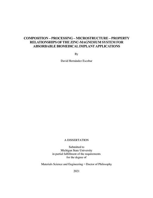 COMPOSITION – PROCESSING – MICROSTRUCTURE – PROPERTY RELATIONSHIPS OF THE ZINC-MAGNESIUM SYSTEM FOR ABSORBABLE BIOMEDICAL IMPLANT APPLICATIONS