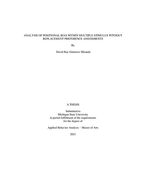 Positional bias is a pattern of responding to a specific location that can be influenced by response effort and/or prior learning history. Within the contexts of preference assessments, positional bias create additional variables that make ascertaining true preferences within a preference assessment more difficult. Prior research on positional bias within preference assessments have focused primarily on its use in paired stimulus assessments due to the complex nature of the multiple-stimulus without replacement preference assessment. The present study is a secondary analysis that utilized four different methods to measure side bias and center bias for 19 young children with autism spectrum disorders. Results indicate that participants had varying degrees of biased responding but collectively engaged in little biased responding. Present study includes discussion of general patterns of responding, an analysis of the four methodologies, and general recommendations for the application of these methodologies.