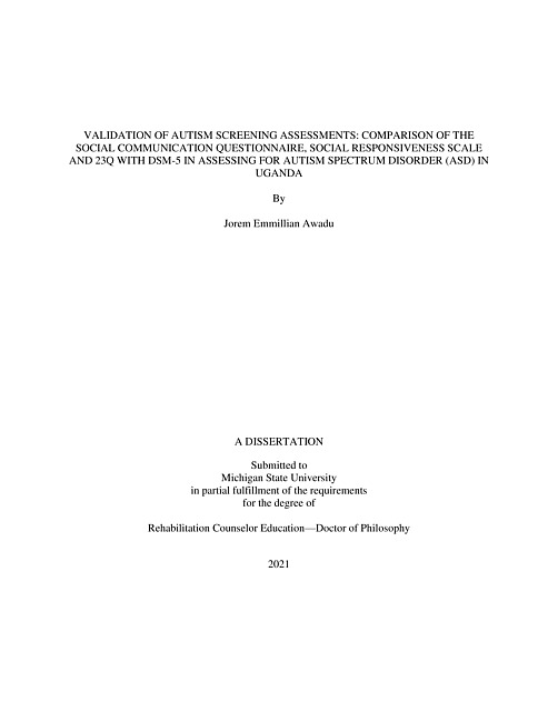 VALIDATION OF AUTISM SCREENING ASSESSMENTS : COMPARISON OF THE SOCIAL COMMUNICATION QUESTIONNAIRE, SOCIAL RESPONSIVENESS SCALE AND 23Q WITH DSM-5 IN ASSESSING FOR AUTISM SPECTRUM DISORDER (ASD) IN UGANDA