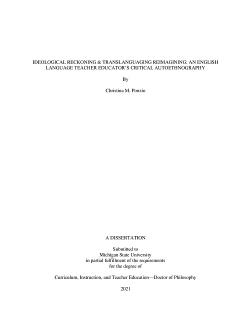 A limited body of research has investigated English language teacher educators’ positionalities and pedagogies (Peercy & Sharkey, 2018; Yazan, 2019), particularly with respect to translanguaging. To that end, the purpose of this critical autoethnography, or what I will later describe as a nos/otras autoethnography (Anzaldúa, 2015), is for me to examine my ideological reckoning and translanguaging reimagining as a language teacher (LT) and language teacher educator (LTE) based on the following questions:1. How did my ideological stance as a language educator shift across my pre-service and in-service LT experiences as well as my first years as an LTE? 2. How did my interactions in a nepantla contact zone catalyze and sustain my ideological reckoning and translanguaging reimagining as a White, English-dominant speaking, U.S.-born, beginning LTE? I frame this study within the narrative traditions of Gloria Anzaldúa (2012, 2015), whose work consistently defied linguistic conventions and critiqued the U.S. history of linguistic terrorism and settler-colonization. I draw upon her theorization of (des)conocimientos, nos/otras, and nepantla (Anzaldúa, 2015) in order to (1) reckon with the influence of assimilationist language ideologies (Irvine, 1989; Wollard, 1998) on my own language learning and teaching, and (2) to reimaging my language pedagogy through more heteroglossic (Bakhtin, 1981; García, 2009) and translanguaging (Williams, 1994, 1996; García & Li Wei, 2014) perspectives. Specifically, I bring together Anzaldúa’s (2015) theorization of nepantla with the notion of contact zones (Pratt, 1991; Canagarajah, 2013) to describe the collision, fracturing and transformation that emerged through the intentional juxtaposition of beliefs, identities, language practices, and experiences as a part of my participation in a collaborative self-study group named Transnetworking for TESOL Teachers (TTT. I begin by tracing my “Ideological Starting Point,” narrating my language and educational history from childhood through my undergraduate teacher preparation program; I also provide a brief account of my eight years as an LT and my first two years as an LTE (1985-2018). Next, I narrate my “Ideological Reckoning” through consideration of data generated during my early experiences as a LTE before zooming into my experience as a part of TTT, a collaborative self-study group committed to exploring translanguaging. In the final findings chapter, I describe my “Bodymindsoul Transformation,” which overlaps with and extends beyond my interactions with TTT to more closely explore my personal self-study as a LTE. This study illustrates that the overlapping and iterative self-study conducted as a part of TTT emboldened me to contend with my complicity in perpetuating English language education as white supremacist settler-colonial enterprise and to pursue new opportunities to expand my own translanguaging capacity. Hence, this study suggests critical self-reflexivity and collaborative inquiry in what I am calling nepantla contact zones (Pratt, 1991; Canagarajah, 2013; Anzaldúa, 2015) can galvanize white, English-dominant LTs and LTEs to reckon with their own positionalities and reimagine English language education. I conclude with implications for translanguaging, autoethnographic approaches to research, and language teacher education.