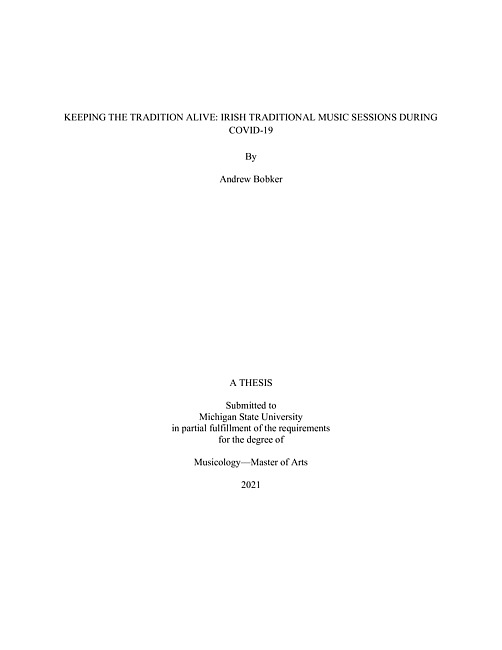 In the spring of 2020, performers of traditional Irish music responded to pandemicinducedsocial distancing by creating a new variant of an old tradition: the virtual Irish session. Unlike conventional pub sessions, virtual sessions occur entirely in virtual space, facilitated by conferencing applications like Zoom or YouTube livestreaming. The move to virtual sessions presents numerous challenges to the traditional structure and norms of Irish traditional music. This thesis will explore the strategies and motivations of Irish musicians as they have adapted to the conditions of COVID-19 and isolation. Maintaining an authentic practice within the auspices of technological innovation involves the negotiation of geography, ethnicity, and selective tradition in a complex social space. This work is based in large part on ethnographic research conducted between March and December of 2020, including both in-person interviews and Internet ethnography. Interviews were conducted with musicians in Austin, Texas; Portland, Maine; Seattle, Washington; and Boston, Massachusetts.