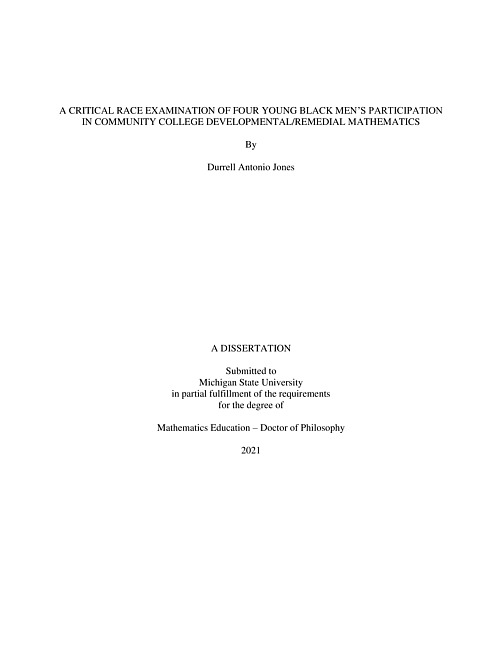 A CRITICAL RACE EXAMINATION OF FOUR YOUNG BLACK MEN’S PARTICIPATION IN COMMUNITY COLLEGE DEVELOPMENTAL/REMEDIAL MATHEMATICS ByDurrell Antonio JonesCounterstory, an analytical tool of Critical Race Theory, was used in this dissertation to foreground the voices of four young Black men completing a non-credit bearing developmental or remedial mathematics (DevRemMath) course at Suburban Community College (SCC). This study presents young Black men’s first-person perspectives about the conditions that determined their learning and doing of postsecondary mathematics, which is operationalized in this dissertation as participation. Their narratives further clarify the race-gender dimensions of participation, and the factors that promoted or deterred participation in DevRemMath at SCC. The study offers several implications for advancing racial justice in DevRemMath and postsecondary mathematics learning, which include reframing how faculty and administration respond to the needs of young Black men in planning and delivering DevRemMath instruction, as well as naming the significance of faculty interactions with young Black men to counter barriers to their academic success. The dissertation concludes with recommendations for (re)structuring DevRemMath spaces in order to better strengthen young Black men’s participation in the learning and doing of postsecondary mathematics. Keywords: Critical Race Theory (CRT), Counter Storytelling, Master narrative, Developmental mathematics, Remedial mathematics, Black males, Community College