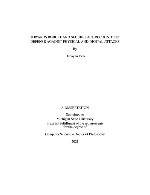 The accuracy, usability, and touchless acquisition of state-of-the-art automated face recognition systems (AFR) have led to their ubiquitous adoption in a plethora of domains, including mobile phone unlock, access control systems, and payment services. Despite impressive recognition performance, prevailing AFR systems remain vulnerable to the growing threat of face attacks which can be launched in both physical and digital domains. Face attacks can be broadly classified into three attack categories: (i) Spoof attacks: artifacts in the physical domain (e.g., 3D masks, eye glasses, replaying videos), (ii) Adversarial attacks: imperceptible noises added to probes for evading AFR systems, and (iii) Digital manipulation attacks: entirely or partially modified photo-realistic faces using generative models. Each of these categories is composed of different attack types. For example, each spoof medium, e.g., 3D mask and makeup, constitutes one attack type. Likewise, in adversarial and digital manipulation attacks, each attack model, designed by unique objectives and losses, may be considered as one attack type. Thus, the attack categories and types form a 2-layer tree structure encompassing the diverse attacks. Such a tree will inevitably grow in the future. Given the growing dissemination of ``fake news” and "deepfakes", the research community and social media platforms alike are pushing towards generalizable defense against continuously evolving and sophisticated face attacks. In this dissertation, we first propose a set of defense methods that achieve state-of-the-art performance in detecting attack types within individual attack categories, both physical (e.g., face spoofs) and digital (e.g., adversarial faces and digital manipulation), then introduce a method for simultaneously safeguarding against each attack.First, in an effort to impart generalizability and interpretability to face spoof detection systems, we propose a new face anti-spoofing framework specifically designed to detect unknown spoof types, namely, Self-Supervised Regional Fully Convolutional Network (SSR-FCN), that is trained to learn local discriminative cues from a face image in a self-supervised manner. The proposed framework improves generalizability while maintaining the computational efficiency of holistic face anti-spoofing approaches (< 4 ms on a Nvidia GTX 1080Ti GPU). The proposed method is also interpretable since it localizes which parts of the face are labeled as spoofs. Experimental results show that SSR-FCN can achieve True Detection Rate (TDR) = 65% @ 2.0% False Detection Rate (FDR) when evaluated on a dataset comprising of 13 different spoof types under unknown attacks while achieving competitive performances under standard benchmark face anti-spoofing datasets (Oulu-NPU, CASIA-MFSD, and Replay-Attack).Next, we address the problem of defending against adversarial attacks. We first propose, AdvFaces, an automated adversarial face synthesis method that learns to generate minimal perturbations in the salient facial regions. Once AdvFaces is trained, it can automatically evade state-of-the-art face matchers with attack success rates as high as 97.22% and 24.30% at 0.1% FAR for obfuscation and impersonation attacks, respectively. We then propose a new self-supervised adversarial defense framework, namely FaceGuard, that can automatically detect, localize, and purify a wide variety of adversarial faces without utilizing pre-computed adversarial training samples. FaceGuard automatically synthesizes diverse adversarial faces, enabling a classifier to learn to distinguish them from bona fide faces. Concurrently, a purifier attempts to remove the adversarial perturbations in the image space. FaceGuard can achieve 99.81%, 98.73%, and 99.35% detection accuracies on LFW, CelebA, and FFHQ, respectively, on six unseen adversarial attack types.Finally, we take the first steps towards safeguarding AFR systems against face attacks in both physical and digital domains. We propose a new unified face attack detection framework, namely UniFAD, which automatically clusters similar attacks and employs a multi-task learning framework to learn salient features to distinguish between bona fides and coherent attack types. The proposed UniFAD can detect face attacks from 25 attack types across all 3 attack categories with TDR = 94.73% @ 0.2% FDR on a large fake face dataset, namely GrandFake. Further, UniFAD can identify whether attacks are adversarial, digitally manipulated, or contain spoof artifacts, with 97.37% classification accuracy.