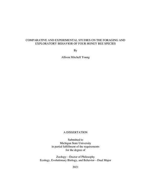 One of the primary challenges foraging animals face is deciding how to divide their time between exploitation of known resources and exploration for new resources. As foraging is costly, investment in exploration should be mediated by natural selection to balance its costs and benefits in ways are tuned to species life history (e.g., lifespan, reproduction rate, activity level), individual state (e.g., experience, hunger, cognitive abilities), and environmental conditions (e.g., reward predictability, distribution, abundance). Efforts to understand the role each factor plays in the exploitation-exploration tradeoff are complicated by the complex scenario-specific ways in which they interact. In addition, the lack of comparative information on exploratory behavior limits our ability to draw generalizations. In this dissertation, I use a combination of experiments and comparative studies in four honey bee species to examine how interactions between life history, individual experience, and environmental conditions shape investment in foraging and exploration. Each chapter addresses how the interaction between two factors (e.g., life history and environment, individual experience and environment) shapes honey bee exploration, or provides an in-depth look at a previously understudied aspect of Asian honey bee life history and foraging behavior that could play a role in shaping their exploratory behavior. In Chapter 1, I investigate how evolved differences in life history interact with environmental reward context to shape worker investment in exploration in four honey bee species. Species that face higher mortality costs from exploration were generally less exploratory when confronted by a decrease in a familiar reward, but all species increased their investment in exploration as they experienced larger decreases in resource quality. These findings suggest that exploratory behavior has been tuned by natural selection to species life history but is also sensitive to the current environmental conditions. In Chapter 2, I use Apis mellifera to investigate how different past experiences with environmental predictability in the location or timing of rewards influence how honey bees search when those rewards are no longer available. My results show that honey bees that have had experience with unpredictable rewards are less precise but equally persistent in their search for vanished rewards, as compared with bees that have had experience with predictable rewards. This result suggests that a bee’s experience with resource predictability shapes the way she searches but not her overall investment in exploration. In Chapter 3, I investigate the lifespan and foraging behavior of three honey bee species. For all three species, the age at which a bee first becomes active outside the nest was the primary predictor of her lifespan. Dwarf honey bee (A. florea) workers seem to have the longest lifespan, likely due to their much-delayed onset of flight outside the hive, supporting the idea that species that face higher costs from worker mortality should have longer-lived workers. Finally, in Chapter 4, I examine how investment in diurnal and nocturnal foraging activity by the giant honey bee (A. dorsata) changes across seasons and lunar cycles. I found that this species could be considered both diurnal and crepuscular, as well as facultatively nocturnal. The amount of nocturnal activity performed depended greatly on environmental illumination and the season, whereas crepuscular activity was extremely high regardless of season or illumination. This study paves the way for further investigations into the mortality costs associated with nocturnal foraging, and how those costs might shape their exploratory behavior during the day.
