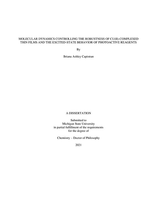 Molecular Dynamics Controlling the Robustness of Cu(II)-Complexed Thin Films and the Excited-State Behavior of Photoactive Reagents