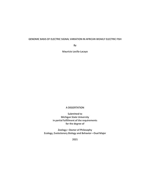 A repeated theme in speciation is reproductive isolation centered around divergence in few, highly variable traits, specially in cases without strong geographic isolation and high speciation rates. Understanding the genomic basis of highly variable traits that are key to speciation is a major goal of evolutionary biology, because they can characterize crucial drivers and foundations of the speciation process. African weakly electric fish (Mormyridae) are a decidedly speciose clade of teleost fish, and their electric organ discharges (EODs) are highly variable traits central to species divergence. However, little is known about the genes and celullar processes that underscore EOD variation. In this dissertation, I employ RNAseq and Nanopore sequencing to study the genomic basis of electric signal variation in mormyrids. In Chapter 1, I take a transcriptome-wide approach to describe the molecular basis of electric signal diversity in species of the mormyrid genus Paramormyrops, divergent for EOD complexity, duration and polarity. My results emphasize genes that influence the shape and structure of the electrocyte cytoskeleton, membrane, and extracellular matrix, and the membrane’s physiological properties. In Chapter 2, I compare gene expression patterns between electric organs that produce long vs short EODs. The results strongly support known aspects of morphological and physiological bases of EOD duration, and for the first time I identified specific genes and broad cellular processes expected to that alter morphological and physiological properties of electrocytes, most striking among these is the differential expression of multiple potassium voltage-gated channels. These two chapters independently identified the gene epdl2 as of interest for EOD divergence. In Chapter 3, I study the molecular evolutionary history of epdl2 in Mormyridae, with emphasis on Paramormyrops. My results suggest that three rounds of gene duplication produced four epdl2 paralogs in a Paramormyrops ancestor. In addition, I identify ten sites in epdl2 expected to have experienced strong positive selection in paralogs and implicate them in key functional domains. Overall, the results of this dissertation greatly solidify and expand our understanding of how the genome underpins changes to electrocytes, and in turn, divergence in their electric signals, a highly variable trait that may facilitate speciation in African weakly electric fish. This work provides an evidence-grounded list of candidate genes for functional analyses aimed to corroborate their contribution to the EOD phenotype.