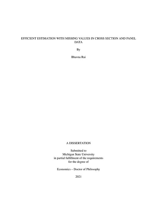 Chapter 1: Efficient Estimation with Missing Data and EndogeneityI study the problem of missing values in both the outcome and the covariates in linear models with endogenous covariates. I propose an estimator that improves efficiency relative to a Two Stage Least Squares (2SLS) based only on the complete cases. My framework also unifies the literature on missing data and combining data sets, and includes the "Two-Sample 2SLS" as a special case. The method is an extension of Abrevaya and Donald (2017), who provide methods of improving efficiency over complete cases estimators in linear models with cross-section data and missing covariates. I also provide guidance on dealing with missing values in the instruments and in commonly used nonlinear functions of the endogenous covariates, likes squares and interactions, without introducing inconsistency in the estimates.Chapter 2: Imputing Missing Covariate Values in Nonlinear ModelsI study the problem of missing covariate values in nonlinear models with continuous or discrete covariates. In order to use the information in the incomplete cases, I propose an inverse probability weighted one-step imputation estimator that provides gains in efficiency relative to the complete cases estimator using a reduced form for the outcome in terms of the always-observed covariates. Unlike the two-step imputation and dummy variable methods commonly used in empirical work ,my estimator is consistent for a wide class of nonlinear models. It relies only on the commonly used "missing at random" assumption, and provides a specification test for the resulting restrictions. I show how the results apply to nonlinear models for fractional and nonnegative responses.Chapter 3: Efficient Estimation of Linear Panel Data Models with Missing CovariatesWe study the problem of missing covariates in the context of linear, unobserved effects panel data models. In order to use information on incomplete cases, we propose generalized method of moments (GMM) estimation. By using information on the incomplete cases from all time periods, the proposed estimators provide gains in efficiency relative to the fixed effects (and Mundlak) estimator that use only the complete cases. The method is an extension of Abrevaya and Donald(2017), who consider a linear model with cross-sectional data and incorporate the linear imputation method in the set of moment conditions to obtain gains in efficiency. Our first proposed estimator uses the assumption of strict exogeneity of the covariates as well as the selection, while allowing the selection to be correlated with the observed covariates and unobserved heterogeneity in both the outcome equation and the imputation equation. We also consider the case in which the covariates are only sequentially exogenous and propose an estimator based on the method of forward orthogonal deviations introduced by Arellano and Bover (1995). Our framework suggests a simple test for whether selection is correlated with unobserved shocks, both contemporaneous and those in other time periods.