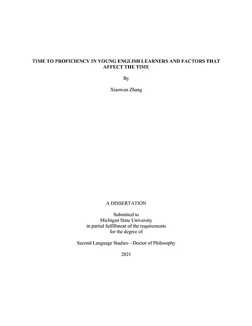 English learner (EL) children (i.e., children learning English as a second language) constitute one of the fastest growing, yet disproportionately underachieving, segments of the U.S. public-school population. A main difficulty that ELs face at school is learning English and content-area knowledge in tandem. Low levels of English proficiency may limit ELs’ abilities to benefit from content instruction in English or to demonstrate knowledge and skills on mainstream academic assessments (Cook, Linquanti, Chinen, & Jung, 2012). This study investigates the time it takes for EL children to attain English proficiency and factors that affect the time by drawing on longitudinal EL data from Michigan. Socio-demographic and English-proficiency assessment data were requested from the Michigan Education Research Institute (MERI) on six cohorts of students who entered Michigan public schools in kindergarten as ELs in 2013-2014 through 2018-2019. All students were followed for up to six years from kindergarten through fifth grade. Discrete-time survival analysis was used to estimate the time that ELs took to attain proficiency as measured by Michigan’s state English language proficiency assessment (i.e., ACCESS for ELLs) and to explore the relationship between time to proficiency and six factors of interests: (a) primary disability type, (b) primary home language, (c) poverty status, (d) home English use, (e) instructional programming, and (f) retention. Findings showed that half of ELs who entered Michigan public schools in kindergarten attained proficiency in five years, with writing being the largest barrier to proficiency for those students. Findings of this study further indicated ELs’ time to proficiency was significantly related to their sociodemographic and educational backgrounds. Specifically, ELs with disabilities, ELs speaking some particular home languages (e.g., Arabic, AfroAisatic, and Spanish), and ELs who ever lived in poverty were less likely to attain proficiency than their peers who did not have those backgrounds. In addition, ELs who received partial instruction in their home language (L1) and ELs who never used English at home were equally likely, and in some cases slightly more likely, to attain proficiency as compared with their peers who were immersed full-time in an English-only environment at school and at home. Lastly, students who were ever retained in grade were less likely to attain proficiency than their peers who were never retained in upper elementary grades despite short-term gains associated with retention in early elementary grades. Implications of these findings point to the importance of improving current accountability systems to reflect the diversity of the EL population, supporting L1 maintenance in the home and school contexts, monitoring the effect of retention on ELs, and providing better writing instruction for ELs.