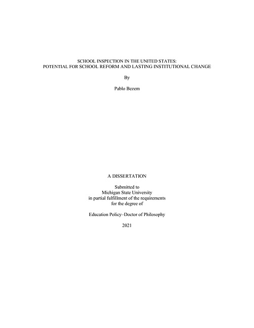In an era of test-based accountability, school inspection may offer a nuanced understanding of school performance and actionable information for improvement. Yet, little empirical evidence exists on its effectiveness in advancing performance, particularly in the United States. This dissertation examines the potential of school inspection as an alternative accountability mechanism through a series of studies based in one of the only U.S. districts to experiment with inspection. Three papers evaluate: 1) How inspectors arrive at their decisions, 2) whether inspections promote principals' attitudes that are associated with lasting institutional change, and 3) effects of inspection on school planning directions. Each of these papers offers a significant contribution to the literature on school inspection and provides evidence regarding the inspection process and its potential to enable school improvement. The first paper inquires about how inspectors evaluate school and reach determinations. To shed light on inspectors' decision-making processes, the case of a U.S. district is contrasted with two long-established international systems. Results reveal that decisions are strongly influenced by local culture and professional traditions. Despite efforts to introduce alternative means for school assessment in the U.S., a test-based accountability mindset dominates and limits the potential of inspection.The second paper investigates whether principals' attitudes towards inspection are those associated with lasting institutional change. This study bridges insights from the organizational change literature in the education field. Semi-structured interviews with 20 principals in the selected U.S. district inquire about the perceived effectiveness of the diagnosis, appropriateness of inspection feedback, and readiness for implementing changes. Results show that strongly positive attitudes toward inspection associated with lasting change. A majority of principals view inspection favorably since its breadth and depth contributes to a more accurate diagnosis of key challenges. Holistic evaluation and actionable findings are not feasible through test-based accountability alone. Principals also express a strong commitment to implementing changes based on inspection feedback. These results provide the first empirical evidence of the influence of school inspection on sustained institutional change. The third essay examines the effect of inspection on school planning. Prior to implementation of reforms, priorities are set through the school planning process. Despite the wide use of inspection globally, no previous study has tested whether a causal relationship exists between inspection and school planning. This study uses mixed methods to examine whether inspection shifts the areas of focus in school planning documents. The study sample comprises 160 public schools in the selected U.S. district. In-depth interviews with school principals reveal that inspections are perceived as useful and led to planned reforms focused in two areas: instructional practices and school climate. Results from a difference-in-differences analysis suggest that inspection shifted the focus of planning documents towards these two areas. Inspection led to nearly a doubling of keywords in improvement plans related to these two focus areas. This study provides empirical evidence regarding the potential of inspection to inform school planning.Overall, this dissertation advances understanding of the potential of school inspection to offer insights for improved school reforms, in a high-stakes, test-based accountability system. Findings demonstrate how local and professional culture influence and condition inspection practices. In addition, I show that principals demonstrate strong positive attitudes towards inspection, which are favorable to sustainable change. Finally, I provide causal evidence that inspection shapes the focus of school improvement plans. These results have implications for U.S. accountability policies and the potential for a more comprehensive approach, beyond test-based accountability.