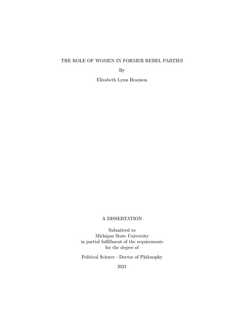 In post-conflict environments, former rebel groups that transition into political parties are critical political actors, as their participation within formal politics is believed to be a crucial guarantee of continued peace and security after war. Yet, for many former rebel parties, the path to political success is littered with challenges in building substantial public support. This dissertation examines a salient strategy through which rebel parties build such support: the inclusion of women. I explore the role of women in rebel parties by asking three related questions: (1) How does women's political representation in rebel parties compare to other political parties? (2) How do legacies of women's wartime inclusion affect women's representation in rebel parties? (3) Which women do rebel parties elect?I begin in Chapter 1 by comparing the role of women in rebel parties to other political parties in post-conflict environments. I argue that these parties have unique incentives to promote the representation of women. By including women, rebel parties stand to distance themselves from their violent conflict legacies and demonstrate they are committed to upholding transparency, democracy, justice, and peace. Novel data on women's candidacy and electoral success at the party-level in post-conflict Africa from 1970-2020 are presented. Findings suggest that rebel parties run and elect significantly more women than other political parties. I find in instances of ongoing violence, women's political representation generally falters, suggesting that these political strategies are only effective during peacetime.Chapter 2 explores the effect of conflict legacies on women's inclusion in rebel parties. Rebel groups that transition into political parties are influenced by their conflict legacies in a myriad of ways. In particular, rebel parties adhere to practices that shaped their identity and garnered wartime support. I argue that the wartime inclusion of women in rebel groups is one such wartime behavior that will carry over to the post-war environment. Using a second novel dataset on women's representation in a global sample of rebel parties from 1970-2020, I find that former rebel parties that included female combatants are more likely to elect a higher proportion of women after war, particularly when women's presence serves to create similar benefits that women offer during war. The results show that when women's wartime combat participation cultivated greater civilian aid and external support during war, rebel parties are more likely to elect women after war.Finally, Chapter 3 considers the role of former rebel women in their respective rebel parties. I ask how former rebel parties create post-conflict political opportunities for their female former members. I argue that the party's integration of these women depends on women's general contributions during war, particularly their roles in the group and its impact on group success. I present a third novel dataset on the election of former female rebels in a global sample of former rebel parties from 1970-2020 and find that women's roles during conflict influence their post-conflict election. Moreover, their integration also influences greater recruitment of other non-rebel women. These findings demonstrate that while many former rebel women are marginalized after war, a select few are successful in translating their wartime experiences into political gains.Overall, this dissertation demonstrates the salient role of women in rebel parties, a role that has been consistently overlooked in the literature. Moreover, these findings suggest that the inclusion of women is a political strategy used by rebel parties, casting doubt on these parties' actual commitment to women and peace.