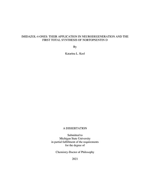Herein, imidazol-4-ones are applied to the areas of methodology development, total synthesis, and small molecule design for proteasome activation. The first total synthesis of nortopsentin D is described, which was completed in 7 linear steps with an overall yield of 1.6%. This convergent synthesis involved the condensation of amidine and dione, followed by a cyclization via a pinacol-like rearrangement to produce the central imidazol-4-one ring. Additionally, a range of imidazol-4-ones were explored for their use as proteasome activators. Out of this research, a new scaffold, N-acylated fluspirilene (5-12), was discovered. This small molecule represents the Tepe lab's first proteasome activator to dock within the Îł2-3 intersubunit pocket and produce a significant increase in IDP degradation in vitro (AC200 1.9 ÎơM, max fold enhancement > 2000%) as well as in cells.