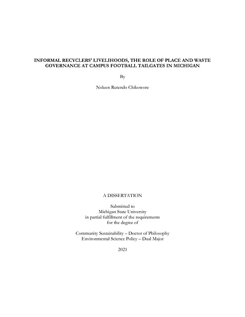 Low-income people worldwide engage in informal or unregulated livelihood activities, but these activities have remained understudied and often misunderstood, especially in the global North cities. Michigan's 10-cent deposit law for the return of beverage containers has led to recycling as a means of earning income, especially at campus football tailgates. Little is known about the livelihood opportunities that campus football tailgates create. To our knowledge, no prior studies have examined the factors that facilitate or constrain canners' activities when collecting aluminum cans and bottles at campus football tailgates. In addition, only a few studies document how place-based contexts influence informal recyclers to (un)successfully engage in their livelihood activity. Lastly, no study has looked specifically at how campus officials effectively govern the waste management system at football tailgates while co-existing productively, specifically with tailgaters and people who earn their income from collecting cans at these events.In this dissertation based on qualitative research, I present three essays related to informal recycling livelihoods, the role of a place-based context, and waste governance at campus football tailgates in the United States. Maximum variation (heterogeneity) sampling, a purposeful sampling method, was used to recruit participants from different races, genders, age groups, and years of experience in either tailgating or collecting cans for income. All three essays used direct observation and semi-structured interviews.The first essay explores the assets that informal recyclers bring to construct their livelihoods and examines the constraints and opportunities that they encounter, using the lens of a modified sustainable livelihood framework. The findings indicate that differences in capital assets such as social networks, physical strength, skills, and access to equipment led to differences in canners' ability to earn an income from collecting cans and bottles. Other significant sources of motivation include contributing to environmental stewardship and recognition for doing so. The study recommends that policy makers support capital assets that enable informal recycling activities and reduce barriers that constrain successful engagement with the livelihood activity.Using the Institutional Analysis Design Framework, the second essay analyzes the roles and relationships among different actors in governing waste at campus football tailgates. It examines the formal and informal rules practiced and how they shape waste governance at on-campus football tailgates and with what outcomes. There is lack of communication between university officials resulting in missed opportunities for improving waste governance.The last essay examines how place-based contexts influence informal recyclers to collect recyclables for income at football tailgates and not in other places. The explores how football tailgates are places that enable canners to engage in their livelihood activity more than other place-based contexts. Canners are self-conscious of the stereotyping, stigma, and discrimination associated with their social identities. The findings offer insights into how a place-based context supports collecting cans for income and recognizes the environmental value of canners compared to other places. Nonetheless, tailgaters recognize the environmental value of canners at football tailgates more than they would at other places. The study contributes to literature on informal recyclers from a global North context and recommends that opening lines of communication among the actors would legitimize the role of canners in campus sustainability.