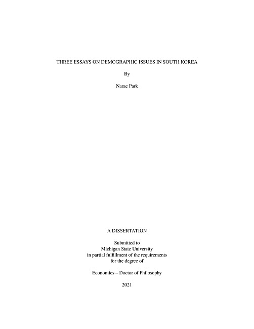 In chapter 1, I estimate the effect of a first birth on the labor market outcomes in South Korea over time using a method proposed by Kleven, Landais, and Sogaard (2019b). In many countries, the child penalty, which is the loss in earnings associated with childbirth, is large and persistent for mothers. My results show how the child penalty in Korea is different from the one in other countries. First, I find that Korean women experience a substantial penalty in earnings with a first childbirth compared to women in other countries. Second, while the child penalty in other countries comes from both the intensive and extensive margins, the penalty for Korean women arises almost exclusively on the extensive margin. Third, I find a substantial drop in earnings for mothers even before the child is born. Finally, to shed light on the source of the child penalty, I examine several of its correlates, including marriage, the lack of work benefits, and opportunity costs.In chapter 2, I analyze the effect of skewed sex ratios at birth on the marriage market. Due to high son preference and reduced fertility rates, sex ratios at birth were skewed from the 1980s to the 2000s in South Korea. This can affect the timing of marriage when those generations start to enter the marriage market. I use large administrative data sets, including the Population Census and the Vital Statistics. The results show that a high SRB delays the marriage of men, while women marry early.In chapter 3, I review the trend in fertility rates and policy changes and finds the source of low fertility rates in Korea. The Korean government spent over 200 billion dollars to increase fertility, but the total fertility rates continues to decline. I compare the trend in fertility rates in Korea with the one in Spain, Italy, and Japan. I show that the low fertility rates in Korea result mainly from delayed marriage.