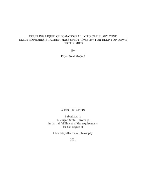Proteomes are very complex with a large number of unique proteoforms spread across a wide concentration dynamic range. This means that an MS-based platform with highly efficient separation and highly sensitive detection of proteoforms is required. Capillary zone electrophoresis-tandem mass spectrometry (CZE-MS/MS) has been suggested as one such platform. When coupled to offline liquid chromatography-based fractionation, CZE-MS/MS has proven to be invaluable to the TDP community.In Chapter 2, the first optimization of dynamic pH junction-based sample stacking for TDP is provided along with one of the first comparisons of reversed-phase liquid chromatography coupled to mass spectrometry (RPLC-MS) and CZE-MS/MS. Optimization of dynamic pH junction is performed with a standard protein mixture, and this platform was ultimately applied to an Eschericia coli (E. coli) whole cell lysate. This resulted in the largest TDP dataset for single-shot CZE-MS/MS. The comparison of RPLC-MS/MS and CZE-MS/MS also included analysis of an E. coli cell lysate and resulted in high numbers of identifications and highlighted the various pros and cons of each method.In Chapter 3, two dimensional LC fractionation (size exclusion chromatography (SEC) and RPLC) was coupled to CZE-MS/MS for deep TDP of E. coli cells. This study resulted in the largest TDP dataset, at the time, for E. coli, identifying 5700 proteoforms and 850 proteins. We were also able to identify and localize various interesting PTMs and estimate protein abundances using a spectral counting method. From this study it was clear thatour platform was comparable to other RPLC-MS/MS methods for deep TDP in terms of number of proteoform identifications and total instrument time.In Chapter 4, we applied our TDP platform to two isogenic colorectal cancer (CRC) cell lines, SW480 and SW620, from primary and metastatic tumors. Genetic changes have been known for a long time to affect CRC progression but this was the first proteoform-level deep TDP study of CRC metastasis. In total, we identified over 23000 proteoforms and over 2000 proteins, for the largest TDP dataset of any cell type and was a 400% increase in terms of identifications over previous deep TDP studies. We used a special database searching tool to identify single amino acid variants (SAAVs) for the largest dataset of proteoforms containing SAAVs. Quantitative analysis identified 460 proteoforms with significant differences in abundance between SW480 and SW620. Several of these proteoforms were also phosphorylated which could further impact disease progression and outcome for a specific patient phenotype and could serve as biomarkers for deciding how to treat a patient or for drug development.In Chapter 5, both activated ion electron transfer dissociation (AI-ETD) and ultraviolet photodissociation (UVPD) at 213 nm were coupled to CZE for deep TDP of E. coli and zebrafish brain samples, respectively. Optimized CZE-AI-ETD and CZE-UVPD resulted in large numbers of proteoform identifications, and many important modifications were identified and localized using these effective fragmentation techniques. This included N-terminal acetylation, methylation, S-thiolation, disulfide bonds, and lysine succinylation.In Chapter 6, a variety of insights into the future of TDP are provided. This includes important applications for TDP, such as personalized medicine, drug development, embryonic development, and pathogen identification. Also, a few advancements to the TDP workflow that may have increased focus on in the future are mentioned.