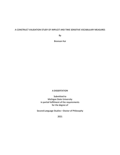 Vocabulary researchers have started expanding their assessment toolbox by incorporating timed tasks and psycholinguistic instruments (e.g., priming tasks) to gain insights into lexical development (e.g., Elgort, 2011; Godfroid, 2020b; Nakata & Elgort, 2020; Vandenberghe et al., 2021). These timed sensitive and implicit word measures differ qualitatively from traditional paper- or accuracy-based vocabulary tests and are believed to tap into lexical strength and representations in the mental lexicon (Elgort, 2018; Godfroid, 2020b). As a result, there have been calls to use both traditional (explicit) and these timed and implicit word measures in a complementary manner (e.g., Godfroid, 2020b; Nakata & Elgort, 2020; Vandenberghe et al., 2021). At the same time, researchers must first develop a thorough understanding of how these different types of measures (explicit vs. implicit and timed vs. untimed) relate to each other before they can make informed decisions on their measurement battery. It is thus well-motivated to examine the construct validity of these measures empirically and systematically. In this validation study, I took the first step to fill this research gap by assessing both the predictive and factorial structure validity of these measures.One hundred and forty-five learners of English took part in five vocabulary tasks: (1) a receptive form-meaning task, where they chose an option representing the meaning of the target word embedded in a sentence, (2) a productive form-meaning task, where they produced the target word to fit a sentence context, (3) a computerized Yes-No (reaction time) test, where they indicated if they knew the target word by pressing keys on their keyboard, (4) a masked repetition priming task with lexical decisions, where they judged if a letter string forms a word in English, and (5) a semantic priming task with lexical decisions. Items in all five tests were the same 40 English words sampled across the 2K - 5K frequency bands.Data analysis involved item inspection and extraction of person-related parameters based on Rasch and/or mixed-effects models. The measures of person ability obtained from individual tasks were then submitted to confirmatory factor analyses in order to assess the psychometric dimensionality of the measure battery. The resulting latent factor(s), representing a pure measure of vocabulary under a specific conceptualization, was then used to predict self-reported proficiency to shed light on their predictive validity. With method effects accounted for, the one-factor solution ("Vocabulary Knowledge") produces a good fit and is preferred based on the principle of parsimony for both the implicit vs. explicit and timed vs. untimed distinctions. This result provides evidence for psychometric unidimensionality of these measures as representing a potential unitary construct of vocabulary knowledge. At the same time, the vocabulary construct has the most explanatory power (predictive validity) when conceptualized distinctly as lexical knowledge (measured untimed tasks) and strength (measured by timed tasks). Taken together, these results foreground the need for researchers to further specify the nature of the vocabulary construct as well as the operational task features with which it can be assessed empirically. Importantly, I call for more measurement validation work as researchers expand their assessment toolboxes in vocabulary research.