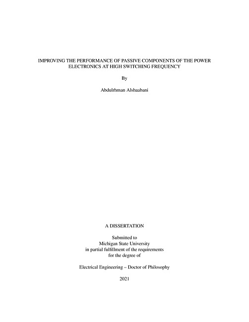Power converters have an important role in modern electric and electronic systems due to different voltage and power level requirements. Magnetic components are considered to be essential elements of the power converters. Storing the energy, filtering the signal, and transferring the energy are the main tasks of the magnetic components in the power converters. With developing the technology of power switches, the power converter can be operated at high frequencies. However, the magnetic components are suffering from their parasitic capacitance at high frequencies. Modeling the parasitic capacitance of the magnetic components is crucial to design power converters at high frequency. To date, the researches that have been conducted to modeling the parasitic capacitance have mainly targeted the low power applications with very high frequencies and high power with multi-layer transformers. Consequently, there remains a blank in the body of knowledge regarding modeling the parasitic capacitance of a single-layer inductor with a magnetic core at medium power. The relation between the number of turns and the parasitic capacitance of the single-layer inductors with the magnetic core should be considered. Moreover, improving the magnetic components by reducing parasitic capacitance is essential. By using the technique of reducing the parasitic capacitance, the resonant frequency of the magnetic components can be shifted to a higher frequency besides improving the impedance of the inductor. Therefore, this dissertation contributes in four main parts: (1) Modeling the parasitic capacitance of a single-layer inductor with a magnetic core. (2) Reducing the parasitic capacitance using the technique of magnetic coupling. (3) Selecting the appropriate range of high operating frequency for power converter applications. (4) Estimating the parasitic capacitance of interleaved coupled two-phase inductors.For the first part, a new approach to determining the total parasitic capacitance of a single-layer inductor with the magnetic core at a medium frequency range that is below the first resonant frequency is presented in this research. The proposed analytical approach can obtain the parasitic capacitance between the winding and core based on the physical structure of the inductor. The analytical approach depends on approximating the rod wire shape to a square shape. The total equivalent parasitic capacitance is derived. The results are verified by finite element analysis and experimental measurements using an impedance network analyzer.The second part of this research presents a technique for improving the performance of an inductor at high frequencies through mitigating effects caused by the parasitic capacitance. This technique adds a small capacitor to the coupled windings of the inductor to reduce the parasitic capacitance of the inductor. The relationship between the parasitic capacitance, magnetic coupling coefficient, and the small capacitor is introduced. The method to size the reduction capacitor is detailed in this research. The results of applying this technique show an improvement in the inductance impedance by 40 dB and shifting the resonant frequency to a higher frequency when ? = 0.97. The experimental results validated the effectiveness of the proposed technique. Moreover, a new methodology to properly select the highest operating frequency for the magnetic components in power electronics devices is presented in this research. Several parameters of the magnetic components such as the resonant frequency and the losses of the magnetic core are taken under consideration. The results of this methodology prove the maintaining the efficiency with reducing the volume of the magnetic core by 70%.Finally, the parasitic capacitance of the interleaved two-phase coupled-inductors is introduced in this research. Besides estimating the parasitic capacitance, the method of determining the size of the interleaved two-phase coupled inductors of boost converter is explained. The result shows the reduction of the size of the two-phase coupled inductors by using the proposed selecting suitable high operating frequency methodology. Moreover, the efficiency of the interleaved coupled inductors boost converter is maintained with reducing the volume by 60% and increasing the operating frequency by doubling the frequency.