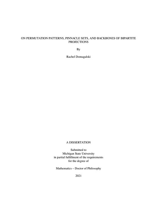 This dissertation encompasses the study of two different fields, one regarding permutations including pattern containment and pinnacle sets, and the other on weighted networks, specifically bipartite projections and their backbones.The study of pattern containment and avoidance for linear permutations is a well-established area of enumerative combinatorics. A cyclic permutation is the set of all rotations of a linear permutation. Callan initiated the study of permutation avoidance in cyclic permutations and characterized the avoidance classes for all single permutations of length 4. We continue this work. In particular, we establish a cyclic variant of the Erdos-Szekeres Theorem that any linear permutation of length mn + 1 must contain either the increasing pattern of length m + 1 or the decreasing pattern of length n + 1. We then derive results about avoidance of multiple patterns of length 4. We also determine generating functions for the cyclic descent statistic on these classes.We then study the pinnacle set, which is the value analogue of a well-studied permutation statistic, the peak set. Let Ï⁰ = Ï⁰1 Ï⁰2 ... Ï⁰n be a permutation in the symmetric group Sn written in one-line notation. The pinnacle set of Ï⁰ denoted Pin Ï⁰ is the set of all Ï⁰i such that piÏ⁰i-1piÏ⁰i+1. The classic peak set statistic consists of the positions of these values. The pinnacle set was introduced by Davis, Nelson, Petersen, and Tenner who showed that it has many interesting properties. In particular, they proved that the number of subsets of [n] = {1,2,...,n} which can be the pinnacle set of some permutation is a binomial coefficient. Their proof involved a bijection with lattice paths and was somewhat involved. We give a simpler demonstration of this result which does not need lattice paths. Moreover, we show that our map and theirs are different descriptions of the same function. Davis et al. also studied the number of pinnacle sets with maximum m and cardinality d which they denoted by p(m,d ). We show that these integers are the well-known ballot numbers and give two proofs of this fact: one using finite differences and one bijective. Diaz-Lopez, Harris, Huang, Insko, and Nilsen found a summation formula for calculating the number of permutations in Sn having a given pinnacle set. We derive a new expression for this number which is faster to calculate in many cases. We also show how this method can be adapted to find the number of orderings of a pinnacle set which can be realized by some Ï⁰ in Sn. This concludes our research on permutations.Bipartite projections are used in a wide range of network contexts including politics (bill co-sponsorship), geography (firm co-location), genetics (gene co-expression), economics (executive board co-membership), and innovation (patent co-authorship). However, because bipartite projections are always weighted graphs, which are inherently challenging to analyze and visualize, it is often useful to examine the 'backbone,' an unweighted subgraph containing only the most significant edges. We introduce the R package backbone for extracting the backbone of weighted bipartite projections, and use two empirical datasets to demonstrate its functionality, bill sponsorship data from the 114th session of the United States Senate and a Globalization and World Cities data set regarding firm locations in 2000.After introducing and demonstrating five different models for backbone extraction, the fixed fill model (FFM), fixed row model (FRM), fixed column model (FCM), fixed degree sequence model (FDSM), and stochastic degree sequence model (SDSM), we compare them in terms of accuracy, speed, statistical power, similarity, and community detection. Here, we aim to find which models perform similarly to FDSM, since the FDSM model controls for both degree sequences exactly. We find that the computationally-fast SDSM offers a statistically conservative but close approximation of the computationally-impractical FDSM under a wide range of conditions, and that it correctly recovers a known community structure even when the signal is weak. Therefore, although each backbone model may have particular applications, we recommend SDSM for extracting the backbone of most bipartite projections.