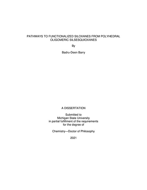 This dissertation is an account of my efforts toward developing strategies for the synthesis of novel functionalized polyhedral oligomeric silsesquioxanes (POSS). These organic/inorganic nanomaterials date back to 1946 and the pioneering work of Scott's synthesis of octamethylsilsesquioxane. POSS cages constitute a framework of silicon-oxygen polyhedron with reactive or inert organic coronae. These hybrid nanostructures are versatile precursors that find applications in polymer chemistry, catalysis, engineering, medicine, and electronics. Their properties are partly dictated by the peripheral organic groups. They are generally benign and easily processible into composite materials with high thermal degradation temperatures, low dielectric constants and superior mechanical properties. These features of POSS compounds have prompted growing interest in their exploration, particularly their use as models for the synthesis of the next generation hybrid nanocomposites. POSS molecules come in different cage sizes with condensed and incompletely condensed structures. The completely condensed analogues are denoted as Tn, where n = number of silicon atoms in the cage and n ⁹́Æ 6. Whereas the cubic/condensed silsesquioxanes were the initially discovered compounds, most explorations today are focused on the incompletely condensed di-, tri-, and tetra-functional scaffolds because of the ability to derivatize them into more functional materials for a myriad of applications. Even with the partially condensed structures, current research focus on this family of compounds has been dominated by the highly symmetric tetrafunctional octasilsesquioxane otherwise known as the double-decker oligomeric silsesquioxane. This functional POSS precursor has enormous potential for the synthesis of nanosized hybrid clusters with defined shape, structure, and physicochemical properties.In this study, efforts have been made to disclose strategies for the synthesis of asymmetrically functionalized double-decker shaped silsesquioxanes that can serve as nano-linkers to two dissimilar polymer matrices. The conversion of dead-end silsesquioxanes into more functional cage precursors, and surface transformation of cubic and functionalized DDSQs into modifiable precursors for the synthesis of well-defined 3D networks well among my aims. POSS cages used in these investigations were obtained either from commercially available cages or cage-like precursors or were synthesized from monomeric trialkoxy- (or trichloro-)silanes by hydrolytic condensation. Products obtained from this study could open an avenue for the exploration of new structure/property relationships and provide a unique way by which cages can be used as linkers to form both linear POSS/polymer and 3D networks. This research promises to open a new research direction for the synthesis of novel materials that combine three unconventional materials into hybrid POSS/polymer composites. With the asymmetric POSS cage as the building block, unprecedented properties may emerge from the synergy of these building blocks.