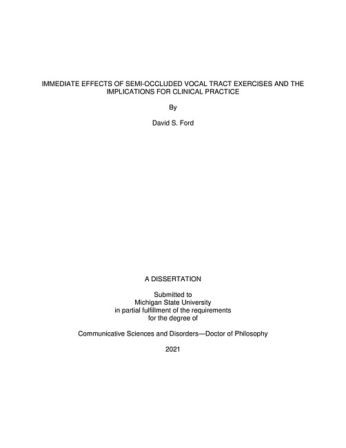 There has been a wealth of research investigating semi-occluded vocal tract exercises (SOVTs) from a theoretical perspective. The physiologic mechanisms underlying these popular voice rehabilitation and training exercises have been studied primarily through modelling studies and non-functional imaging studies (e.g. CT/MRI). More functional research, analyzing acoustic, aerodynamic, EGG, EMG, endoscopic, auditory-perceptual, and self-perceptual effects of SOVTs, have produced variable results. The primary goal of this dissertation was to address the variability of these results and fill in gaps in the literature through four experiments. Experiment 1 sought to identify trends in the prescription practices of SOVTs across speech-language pathologists using a web-based survey. Experiments 2 and 3 aimed to assess the immediate acoustic, auditory-perceptual, and self-perceptual effects of two SOVT exercises (straw phonation and straw phonation into a cup of water) delivered remotely through telepractice. Experiment 4’s objective was to explore the physiologic vocal fold vibratory characteristics that occur during SOVT production, using high-speed videoendoscopy (HSV). Results revealed that clinicians are very knowledgeable about underlying physiology of SOVTs, despite not feeling prepared to prescribe them following their graduate programs. Other interesting findings regarding the effect of clinician experience level on the types of SOVTs being prescribed will be discussed. Acoustically, a statistically significant decrease in shimmer (p=.016) was noted followingstraw phonation. Auditory-perceptual analysis, performed by three experienced SLP raters, revealed a statistically significant increase (p=.009) in the perception of strain following straw phonation into a cup of water. While no significant differences were found between SOVT tasks in self-perception of vocal effort, a statistically significant increase (p=.006) in self-perception of vocal loudness was reported following straw phonation into a cup of water. Descriptive analysis of HSV revealed increases in glottal attack time and glottal offset time following SOVTs. Glottal contact closed quotient provided mixed results. Future research should continue to advance functional outcomes of SOVTs including the study of the underlying physiology using innovative methods such as HSV.
