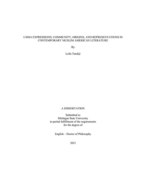 Umma Expressions: Community, Origins, and Representations in Contemporary Muslim American Literature explores how Muslim Americans articulate their "Muslimness" while situating themselves within the Umma or Muslim community. I explore how Muslim writers (re)imagine their plural identities through narrative, grappling with what it means to be Muslim and American simultaneously; how they participate in, react to, challenge, reify, and shape existing rhetoric on Islam and Muslims; and how they participate in the production of American literature and the U.S. cultural imaginary. As it intersects two literary traditions, both national and religious, Muslim American literature weaves in dialogues that have taken place across a myriad of geographical and historical borders for centuries, effectively broadening the scope of American literary studies as well as our conception of America's narrative. As Umma Expressions examines various iterations of Umma that are expressed in contemporary post-9/11 Muslim American literature, each chapter focuses on a primary text that represents a different genre and time period. Beginning with a historical Umma-identification in an American context, Chapter One: "History, Storytelling, and a Muslim American Origins Narrative in Lalami's The Moor's Account" analyzes Laila Lalami's The Moor's Account (2014), which elaborates on the story of a marginalized historical figure named Estebanico. A work of historiographic metafiction, this novel blurs the lines between fiction and history, demonstrating the (inter)textuality of the latter, questioning the process of historiography, and subverting Western narratives of the past. By integrating elements of early African Muslim slave narratives, Lalami contextualizes Estebanico's narrative within Black and Muslim American literary traditions. Chapter Two: "Muslim American Journeys in the Global" examines Willow Wilson's memoir The Butterfly Mosque: A Young American Woman's Journey to Love and Islam (2010) as an autobiographical conversion narrative that documents her journey to and within Islam. Her journey to a publicly visible and communal expression of her Muslimness illustrates a reciprocal relationship between faith, self, and community. Wilson's perspective as an American convert to Islam contributes to a deeper understanding of American Muslimness that grapples with the narrative of Islam vs. West, private vs. public religion, and American individualism vs. community belonging. Chapter Three: "Breathing Through the Dust in Samira Ahmed's Internment" examines how the Muslim American community has struggled with the suffocating pressures of Islamophobia in the United States. I argue that the physical internment of Muslim Americans in Ahmed's Internment (2019), a work of speculative fiction, symbolizes the marginalization of Muslims in American society. The protagonist Layla bears the burdens of Islamophobia as she fights against a system that seeks to silence and eliminate her Muslim American identity.Lalami, Wilson, and Ahmed offer three very different representations of Muslim American identity, each of which articulates belonging to the Muslim Umma while resisting narratives of an Anglo-American nationalist history; a manufactured clash of civilizations; and American Islamophobia via War on Terror culture.