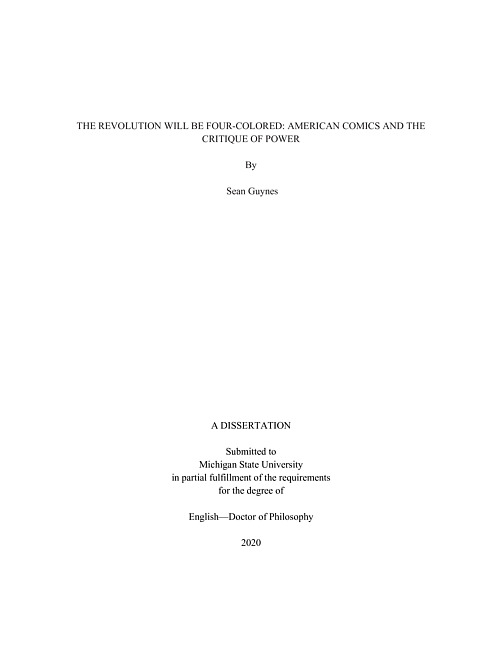 This dissertation, The Revolution Will Be Four-Colored: American Comics and the Critique of Power, is about how mainstream American comics speak (back) to power, particularly where questions of the comics industry and its representation of capitalist crisis; whiteness, white supremacy, and racism; and homophobia and queerness are concerned. The chapters are organized around the three thematics of capital, race, and queerness, though each recognizes the intersections of these forms of power. The comics I discuss open themselves to both symptomatic readings of structures of power, and also reparative and critical ones, emphasizing how comics not only represent the forms of oppression present in American society in the postwar period, but also how they critique and, in the best cases, offer powerful responses to and solutions for the social and political crises of the last several decades. The Revolution Will Be Four-Colored demonstrates how comics enter the discourse of power struggles in the larger field of American popular culture production-demonstrating that a lowbrow medium is indeed capable of revolutionary critique, of complex and sensitive engagement with the politics of liberation. Unsurprisingly, this dissertation is fundamentally concerned with the politics of comics production, circulation, and narratives. Each chapter addresses how these layers of political storytelling and comics worldmaking interact and are indeed inextricable from one another, rendering mainstream comics of the last several decades a field for comics creators to respond to the political pressures of contemporary life.