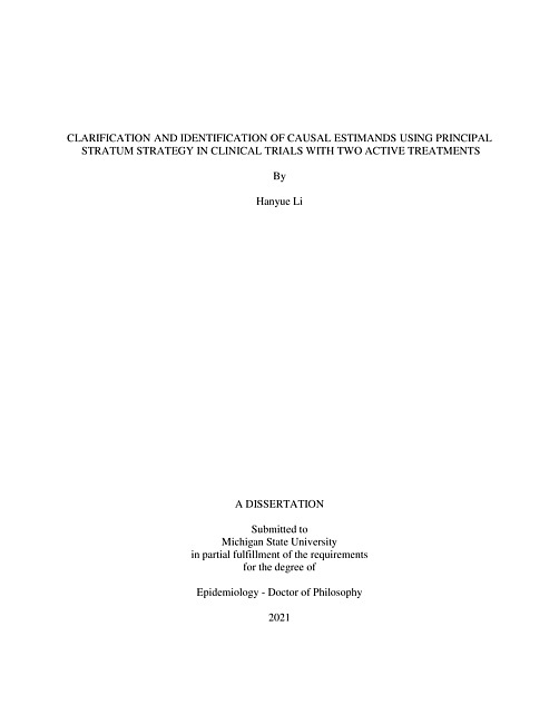 The randomization process in clinical trials is disrupted with the existence of post-randomization events or intercurrent events. The "gold-standard" intention-to-treat (ITT) estimand therefore loses its clinical relevance because it compares treatment assignments instead of actual received treatments. Alternative estimands need to be defined and identified to quantify the causal effect of treatments. In this dissertation, we focus on the intercurrent event of treatment nonadherence and identify the causal estimands in clinical trials with two active treatments. We work under the Neyman-Rubin causal framework and the principal stratification framework. First, we propose a nonparametric approach which identifies the complier average causal effect (CACE) as the ratio of the ITT effect of treatment assignment on the outcome to the ITT effect of treatment assignment on the treatment received under the exclusion restriction, monotonicity, and no partial-compliers assumptions. We discuss violation of the identification assumptions and derive the corresponding bias formulas. Simulations with various degrees of assumption violations are conducted to evaluate the performance and sensitivity of the approach. The results show that the nonparametric approach can yield an unbiased estimator for CACE when sample size is 500 or above and the percentage of compliers is above or equal to 70%. In addition, increasing the number of compliers has the potential to reduce the bias to as close as zero. Second, we propose a multisite design approach which identifies the CACE under the zero correlation assumption. We derive the bias formula when measurement errors and omitted variables exist. Simulations across various scenarios are conducted for the oracle, naive, and bootstrap estimators. The results show that multisite design approach can yield an unbiased estimator if there are no measurement errors and omitted variables. Increasing the number of people in each site can reduce the bias because it reduces the variation of the measurement errors. Increasing the number of sites, on the other hand, does not make a significant impact on the bias. We apply the two proposed approaches to the Sequenced Treatment Alternatives to Relieve Depression (STAR*D) data to identify the causal effects of the medication augmentation and the causal effects of the medication switching. We show that augmenting citalopram with sustained-release bupropion is no better than augmenting citalopram with buspiron in terms of remission but has a higher response rate. Augmenting citalopram with sustained-release bupropion also reduces the 17-item Hamilton Rating Scale for Depression (HAM-D17) score greater than augmenting citalopram with buspiron. We also show that switching to extended-release venlafaxine has a slightly better performance compared switching to sustained-release bupropion in terms of remission, HAM-D17 scores at the end of the study, and reduction of HAM-D17 scores.