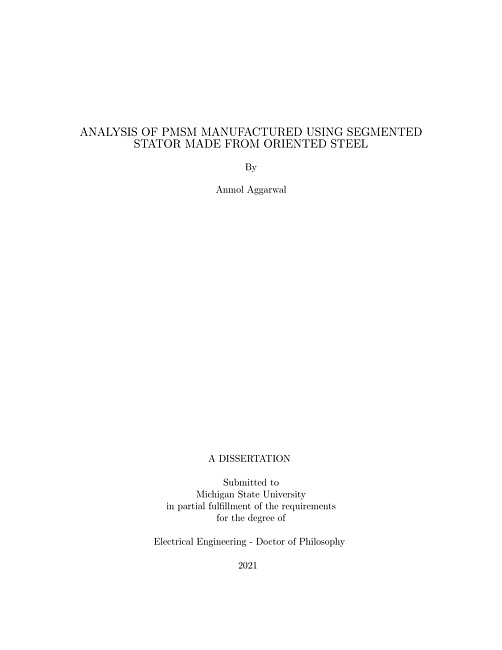 Segmented stators ease the winding process, increase slot fill factor, and improve handling and assembly. Segmented stator construction also allows oriented steel with superior magnetic properties, higher permeability, and lower losses in orientation, also known as rolling direction. Therefore, using oriented steel for the segmented stator construction of PMSM may improve machine performance compared to a machine designed with non-oriented steel, such as an increase in average torque and efficiency.Apart from the clear advantages of segmentation, the increased number of segments increases the unavoidable parasitic gaps between the segments, adversely affecting machine performance. Moreover, oriented steel modeling in modern FEA software is inaccurate, as shown in the literature. An improved model was proposed in the literature to resolve this issue, which requires magnetic properties of the oriented steel in between the rolling and transverse directions. This research aims to analyze the performance of the oriented steel segmented stator PMSM and compare it with conventional non-oriented steel stator PMSM.In this research, the magnetic properties of the oriented steel are determined using a devised experimental setup method. In the proposed method, the flux density of controlled amplitude and frequency is imposed in the oriented steel segmented stator using specially designed devices to estimate the BH and loss curves of the oriented steel. The advantage of the proposed method is that it is comparatively less expensive than the specially modified Epstein frame test. Further, a general theory is proposed to determine the impact of segmentation parameters on the selected performance measures: core losses, average torque, cogging torque, and Back electromotive force. Finally, the estimated magnetic properties of the oriented steel are used to model the oriented steel segmented stator PMSM, and its performance is compared with that of the conventional machine.The experimentally-estimated magnetic characteristics of the oriented steel are different from those estimated using the FEA method. Further, the theory to show the impact of segmentation parameters on the machine performance is validated using numerical experiments on two different machine designs with 72 slots/12 poles and 72 slots/8 poles. The estimated properties are used to model the oriented steel segmented stator PMSM with 72 slots/12 poles. Its performance, with different combinations of segment size and parasitic gap, is compared with conventional stator PMSM of the same design at the same drive cycle. For some segment sizes, the segmented stator machine has lower losses. Moreover, the segmented stator machine has higher cogging torque for all segment sizes and unbalanced BEMF for specific segment sizes..