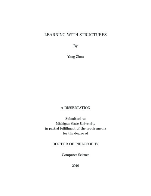 In this dissertation we discuss learning with structures, which appears frequently in both machine learning theories and applications. First we review existing structure learning algorithms, then we study several specifically interesting problems. The first problem we study is the structure learning of dynamic systems. We investigate using dynamic Bayesian networks to reconstruct functional cortical networks from the spike trains of neurons. Next we study structure learning from matrix factorization, which has been a popular research area in recent years. We propose an efficient non-negative matrix factorization algorithm which derives not only the membership assignments to the clusters but also the interaction strengths among the clusters. Following that we study the hierarchical and grouped structure in regularization. We propose a novel regularizer called group lasso which introduces competitions among variables in groups, and thus results in sparse solutions. Finally we study the sparse structure in a novel problem of online feature selection, and propose an online learning algorithm that only needs to sense a small number of attributes before the reliable decision can be made.