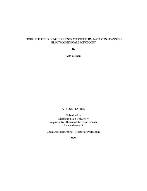Efficient, sustainable chemical reactions will play a large role in addressing many growing issues, including alternative energy production, greenhouse gas conversion, and pharmaceuticals. Electrochemical reactions are attractive due to their relatively mild reaction conditions and direct use of electricity. The understanding and design of the local liquid-solid interface will guide future progress in electrocatalytic reactions.Over time, nature has evolved many highly efficient reactions through enzymatic reactions. These long-studied catalysts provide complex reaction environments that: 1) enhance interaction with reactants, 2) protect intermediates from side reactions, 3) increase the rates of reactions, and 4) selectively react to a specific product. The overarching lesson to be learned is that the local reaction environment plays a large role in the catalyst's reactivity, selectivity, and efficiency. One way to characterize the local environment is through scanning electrochemical microscopy (SECM), in which a small electrochemical probe is rastered over an interface. A quantitative correlation of the probe response to concentration provides a direct measurement of the local environment.The presence of the SECM probe itself can induce changes in the local environment. Comparing the changed local environment (in situ) to what it would be without the probe present (operando), shows large differences of up to 120% under specific operating conditions. A few physical parameters such as the surface site geometry are shown to have an impact on how significant the probe effects are. Additional parameters such as the tip geometry and tip-surface separation are also to have an impact.A finite element method (FEM) simulation informed by experiments is used to examine the above-mentioned tip effects. It is found that fitting responses to other frequently used electrochemical measurements, such as approach curves and CVs, to parameterize the model appropriately describes experimental SECM results. We first apply this method to study platinum nanoparticles, where a ̃50 nm resolution is the highest resolution to our knowledge for AFM-SECM. Through statistical analysis of the surface, an isolated nanoparticle SECM response is correlated with a concentration profile. It is found that the concentration profile has minimal probe effects due to the use of a conical electrode.Applying a similar approach, we also study the probe effects in pH detection during hydrogen evolution and CO2 reduction. Where we match experimental results to parameterize the system. It shown that there is a pH difference of up to ̃7 pH units underneath the probe due to hindered diffusion. However, even with these large differences, the probes are still able to reflect the trends seen without the probe present. Moreover, it is shown that the physical parameters have correlated responses, indicating that hindered diffusion is controlled by the insulation radius and tip-surface separation.Finally, the importance of the analyte is discussed with regard to its interaction with the tip. In addition to the concentration impact on the response signal, the compatibility with the tip need be considered. Degradation of the tip and/or the redox couple of choice will detrimentally affect the ability to examine the local interface. We show that, of the redox couples examined, ferrocene-based compounds appear to best satisfy the most crucial factors of stability and mild redox potentials.Overall, this work studies and removes the impact of the probe for local concentration detection using SECM. This work acts as a guide to quantitatively study the local environment of electrocatalyzed reactions. This is realized through a combined experimental-FEM approach in which the simulation is informed by experiments such that it's representative of the experimental environment.