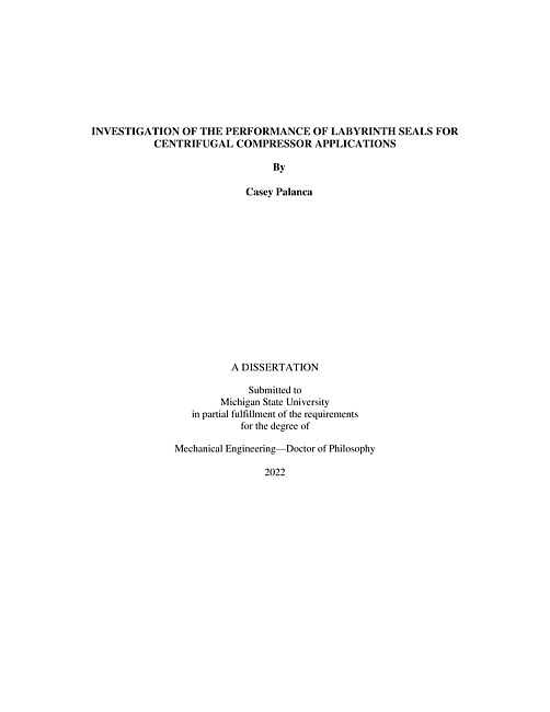 ABSTRACTINVESTIGATION OF THE PERFORMANCE OF LABYRINTH SEALS FOR CENTRIFUGAL COMPRESSOR APPLICATIONS By Casey Palanca Labyrinth seals were one of the first seal configurations used in modern turbomachinery and, due to their robust qualities and relatively low-cost productions, remain one of the most widely used seal configurations today. Their primary purpose is to control internal leakage between the rotating and stationary components of rotating machinery, including the centrifugal compressor. A reduction in secondary leakage flow will always be accompanied by an increase in efficiency. However, while fulfilling the objective of restricting secondary fluid flow, labyrinth seals have been known to cause adverse stability effects on the rotor. Driving forces inside the cavities from the circumferential flow path have been known to be a potential source of destabilizing vibrations. Therefore, accurately predicting these forces is a primary interest in compressor design. These forces are characterized by stiffness and damping coefficients. The present study utilizes the growing advances in CFD to understand, model, and predict the aerodynamic and rotordynamic performance of labyrinth seals. The scope of this work progresses from a well-established steady state CFD method to a more novel transient CFD approach. The benefits and disadvantages of each method are evaluated and discussed by comparing accuracy, reliability, and computational efficiency. Each method is validated with experimental data. Additionally, the proposed transient CFD method can be used to perform a reasonably accurate prediction of the frequency-dependent rotordynamic coefficients by using a Fast Fourier Transform analysis on the monitored force response and displacement data. Lastly, the transient CFD approach is expanded upon by investigating the flow characteristics of long 18 tooth on rotor balance piston labyrinth seal modeled with abradable grooves on the stator. It was discovered that the creation of abradable grooves on the stator can cause the vortex between the labyrinth teeth to change directions (clockwise to counterclockwise). This observation is used to determine the relationship between the flow pattern and rotordynamic performance. A parametric study shows the effect of abradable groove geometries and operating flow conditions on the labyrinth seal rotordynamic coefficients.