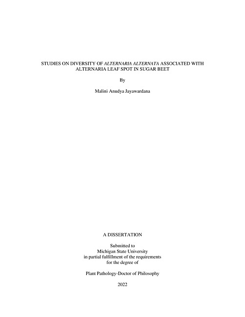 Alternaria leaf spot (ALS) is one of the foliar diseases that can impact sugar beet. Recently, ALS has been an increasing issue in fields from several states in the United States including Michigan. One of the most common causative agents of ALS is Alternaria alternata. This same organism has been reported as a pathogen not only in sugar beet, but also in a number of other crops. Michigan is the second most agriculturally diverse state in the United States and a wide range of crops are grown in the state. Since A. alternata is a pathogen on a number of crops currently grown and associated with sugar beet crop rotation in Michigan, it is important to learn about the interactions between A. alternata and its hosts. Therefore, the current projects were carried out to examine some of the host-pathogen interactions in A. alternata with a focus on ALS in sugar beet. The first project addressed developing effective inoculation methods for ALS in the laboratory, greenhouse or in the field. An effective inoculation method for ALS in sugar beet is important for assessing potential management tools for ALS such as screening for resistance and for fungicide efficacy. A detached leaf assay and a greenhouse inoculation with the inoculum in 0.2% malt extract as an outside nutrient source indicated a significant difference between susceptible and resistant varieties for the disease. Field results showed a significant effect of inoculation in three out of four years but showed issues with other pathogens and still need further testing. However, preliminary evidence for a consistent inoculation was observed in 2021, where the inoculum in an outside nutrient source, similar to what we used in the greenhouse, gave higher disease severity than a non-inoculated control or water-suspended inoculum. The diversity of A. alternata was observed in the second and third projects. Aspects of the host range of A. alternata were examined by isolating the pathogen from four crops growing in Michigan and cross-inoculating each isolate across four hosts. All the A. alternata strains caused lesions on all four host crops tested regardless of the crop from which they originally were isolated. Therefore, the results supported a wide host range of A. alternata. Furthermore, genetic diversity of A. alternata was examined in the third project. A total of 48 A. alternata isolates, collected from four hosts in Michigan, and in-silico data for an additional 15 A. alternata isolates from different hosts in other geographic areas, were used in a genetic analysis using three loci. The phylogenetic tree in this study agreed with previous reports of a high level of genetic diversity for A. alternata. This was the first study to examine diversity on beet and indicated similar diversity to what has been observed on other crops like potato and apple. No clear separation was observed between A. alternata strains related to the host from which they were originally collected. This further supports a lack of host specialization of A. alternata among the diverse hosts examined. Therefore, care should be taken when including these crops in a crop rotation system. If these crops are grown in rotation, the potential for disease development needs to be considered for appropriate management. The pathogen diversity also has implications for screening for host resistance.
