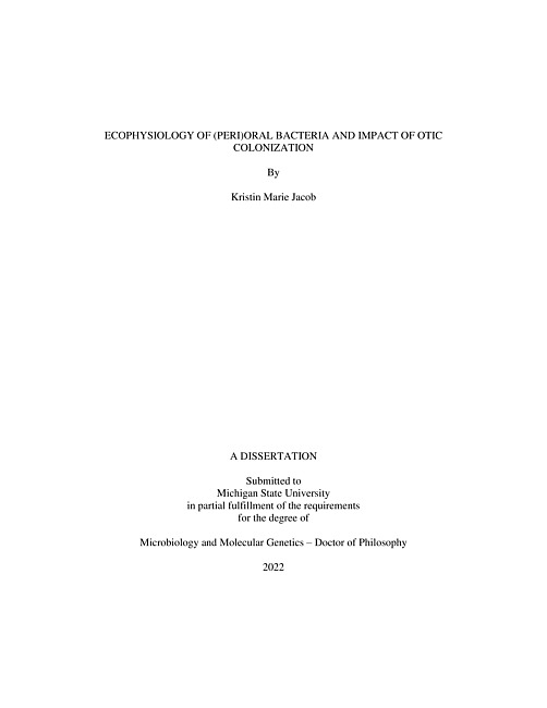 The middle ear is typically assumed to be sterile in health due to its secluded location, closed off from external forces by the tympanic membrane (ear drum) and from the naso/oropharynx by a collapsed Eustachian tube. However, the periodic opening of the Eustachian tube to the naso/oropharyngeal space, which releases pressure across the eardrum and drains otic fluids, could introduce bacteria. Previous studies have tested for the presence of bacteria in the uninfected otic cavity using samples collected via invasive surgeries (through or around the eardrum). Findings from these studies are controversial due to contradictory results between studies, lack of critical experimental controls, and sampling of participants with underlying ailments (i.e., cochlear implant surgery) that could impact the microbiology of the otic mucosa. The studies reported herein bypass these limitations by using samples of otic secretions collectively non-invasively (through the mouth) in a cohort of healthy young adults. This dissertation describes cultivation-dependent methods to investigate the microbiology of the middle ear in health. The study used an IRB-approved protocol (#17-502) to collect otic secretions in order to 1) sequence their microbiome (contribution by Dr. Joo-Young Lee) and 2) recover in pure culture otic bacteria for further characterization (my contribution). As controls, we also collected buccal (top palate and inside of cheeks) and oropharyngeal swabs from each participant. Of the collected secretions, samples from 19 individuals were used for culture independent studies, while samples from the remaining 3 participants were subjected to culture dependent studies. 16S rRNA-V4 sequencing detected a diverse and distinct microbiome in otic secretions comprised primarily of strictly anaerobic bacteria belonging to the phyla Bacteroidetes, Firmicutes and Fusobacteria, and to a lesser extent facultative anaerobes (Streptococcus). I recovered from the otic, oropharyngeal, and buccal secretions 39 isolates of predominantly facultative anaerobes belonging to Firmicutes (Streptococcus and Staphylococcus), Actinobacteria (Micrococcus and Corynebacterium), and Proteobacteria (Neisseria) phyla, and used partial 16S rRNA amplicon sequences to demonstrate the distinct phylogenetic placement of otic streptococci compared to the oral ancestors (Chapter 2). This finding is consistent with the ecological diversification of oral streptococci once in the middle ear microenvironment. The recovery of streptococci and transient migrants (Staphylococcus, Neisseria, Micrococcus and Corynebacterium) from otic secretions prompted us to study the adaptive responses that give the streptococcal migrants a competitive advantage during the colonization of the middle ear (Chapter 3). For these studies, I sequenced and partially assembled the genomes of the otic isolates and used the full length 16S rRNA sequences for taxonomic demarcation at the species levels. Phylogenetic analyses demonstrated the oral ancestry of the otic streptococci, which retained from the otic adaptive traits critical for growth and reproduction in the middle ear mucosa (biofilm formation, mucolytic and proteolytic activity, robust growth under redox fluctuations, and fermentative production of lactate, a key metabolic intermediate in the otic trophic webs). These adaptive traits give oral streptococci a colonization advantage over competing (peri)oral migrants such as Staphylococcus. Furthermore, the otic streptococci inhibited the growth of otopathogens, including Staphylococcus aureus. These antagonistic interactions give streptococci a competitive advantage during the colonization of the middle ear and suggest a role for these commensals in promoting mucosal health. The ability of staphylococcal migrants to breach the middle ear mucosal barrier and cause infections prompted us to study the environmental factors that facilitate the spreading of staphylococci from the nasal to the middle ear mucosa. Allergies, respiratory maladies (cold, flu), or (peri)oral bacterial infections (sinus, adenoids, tonsils, etc.) lead to inflammation of the Eustachian tube and changes in the rheological properties of the otic mucus that increase the risk of infections. Thus, we examined the spreading of staphylococci on mucus-like viscous surfaces (semisolid agar plates). In Chapter 4, I show that mucins, the mucosal glycoproteins that control the viscosity and wettability of the mucus layer, induce the rapid spreading and dendritic expansion of clinical isolates closely related to S. aureus and Staphylococcus epidermidis but not of Staphylococcus hominis. Mucin glycosylation controlled the hydration of the mucoid surface and the ability of the cells to spread rapidly, in a process that was dependent on the secretion of surfactant-active, phenol-soluble modulins via the agr-quorum sensing two-component system. These results provide a plausible explanation for the rapid spreading of staphylococcal otopathogens from the nasopharynx to the middle ear through a swollen, and mucin-rich Eustachian tube. The work described in this dissertation provides much needed understanding of the adaptive responses that allow (peri)oral bacteria to colonize the middle ear. The studies add to the accumulating evidence that the middle ear mucosa is not sterile but rather harbors a commensal microbiota in health. These commensal community shares many metabolic similarities with ancestors in oral biofilms and retain adaptive traits critical for growth in the otic mucosa and inhibition of otopathogens. Additionally, this work identifies environmental factors that could contribute to staphylococcal virulence, broadening the understanding of newly identified motility phenotypes in the genus that could provide novel pharmaceutical targets.