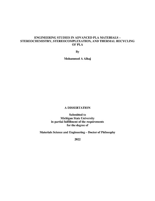 Engineering studies in advanced PLA materials - stereochemistry, stereocomplexation, and thermal recycling of PLA
