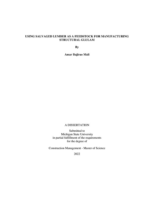 Every year tons of old wood end up in landfill landfills as there is no lucrative alternative. A glued-laminated timber section made with salvaged lumber could make an efficient use of the salvaged material and reduce the cost of wood in the market. A 3-point bending test was conducted on a total of 120 specimens to investigate the mechanical properties of glued-laminated timber manufactured using salvaged lumber. Balanced layups were used for this test. The MOE, MOR, and reliability of the salvaged lumber were assessed according to the experimental results. The influence of the position of salvaged lumber on the MOE and MOR of glulam was investigated by one-way ANOVA. The influence of the type of adhesive used for manufacturing glulam were was also studied. The results show that that when compared with control samples of glulam, the glulam manufactured with 60% of salvaged lumber had a reduction of 10.5% in MOR, 10.5% in MFL, and 1.9% in MOE as shown in table 4.1. when compared with control samples of glulam the glulam manufactured with 40% of salvaged lumber had a reduction of 4.7% in MOR, 4.5% in MFL, and 1.35% in MOE. These reduction percentages are less than 11% for all mechanical properties. In other words, we can say that even for glulam samples made of 60% of salvaged lumber the reduction percentage for all mechanical properties is going to be less than 11%. The reduction percentage for MOE between two consecutive grades turns out to be 33% approximately so we can safely say in absence of any data about a given salvaged sample we can assume that MOE of that salvaged lumber will be one grade below the actual MOE of that sample before use.