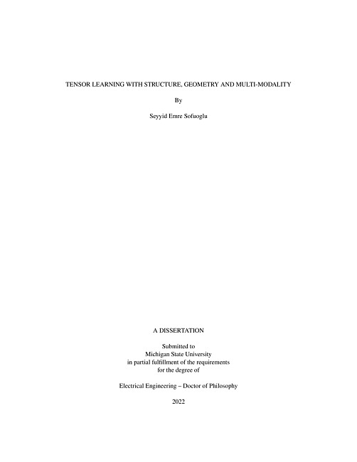 With the advances in sensing and data acquisition technology, it is now possible to collect datafrom different modalities and sources simultaneously. Most of these data are multi-dimensional innature and can be represented by multiway arrays known as tensors. For instance, a color image is athird-order tensor defined by two indices for spatial variables and one index for color mode. Someother examples include color video, medical imaging such as EEG and fMRI, spatiotemporal dataencountered in urban traffic monitoring, etc. In the past two decades, tensors have become ubiquitous in signal processing, statistics andcomputer science. Traditional unsupervised and supervised learning methods developed for one-dimensional signals do not translate well to higher order data structures as they get computationallyprohibitive with increasing dimensionalities. Vectorizing high dimensional inputs creates problemsin nearly all machine learning tasks due to exponentially increasing dimensionality, distortion ofdata structure and the difficulty of obtaining sufficiently large training sample size. In this thesis, we develop tensor-based approaches to various machine learning tasks. Existingtensor based unsupervised and supervised learning algorithms extend many well-known algorithms, e.g. 2-D component analysis, support vector machines and linear discriminant analysis, with betterperformance and lower computational and memory costs. Most of these methods rely on Tuckerdecomposition which has exponential storage complexity requirements; CANDECOMP-PARAFAC(CP) based methods which might not have a solution; or Tensor Train (TT) based solutions whichsuffer from exponentially increasing ranks. Many tensor based methods have quadratic (w.r.tthe size of data), or higher computational complexity, and similarly, high memory complexity. Moreover, existing tensor based methods are not always designed with the particular structure ofthe data in mind. Many of the existing methods use purely algebraic measures as their objectivewhich might not capture the local relations within data. Thus, there is a necessity to develop newmodels with better computational and memory efficiency, with the particular structure of the dataand problem in mind. Finally, as tensors represent the data with more faithfulness to the originalstructure compared to the vectorization, they also allow coupling of heterogeneous data sourceswhere the underlying physical relationship is known. Still, most of the current work on coupledtensor decompositions does not explore supervised problems. In order to address the issues around computational and storage complexity of tensor basedmachine learning, in Chapter 2, we propose a new tensor train decomposition structure, which is ahybrid between Tucker and Tensor Train decompositions. The proposed structure is used to imple-ment Tensor Train based supervised and unsupervised learning frameworks: linear discriminantanalysis (LDA) and graph regularized subspace learning. The algorithm is designed to solve ex-tremal eigenvalue-eigenvector pair computation problems, which can be generalized to many othermethods. The supervised framework, Tensor Train Discriminant Analysis (TTDA), is evaluatedin a classification task with varying storage complexities with respect to classification accuracyand training time on four different datasets. The unsupervised approach, Graph Regularized TT, isevaluated on a clustering task with respect to clustering quality and training time on various storagecomplexities. Both frameworks are compared to discriminant analysis algorithms with similarobjectives based on Tucker and TT decompositions. In Chapter 3, we present an unsupervised anomaly detection algorithm for spatiotemporaltensor data. The algorithm models the anomaly detection problem as a low-rank plus sparse tensordecomposition problem, where the normal activity is assumed to be low-rank and the anomaliesare assumed to be sparse and temporally continuous. We present an extension of this algorithm, where we utilize a graph regularization term in our objective function to preserve the underlyinggeometry of the original data. Finally, we propose a computationally efficient implementation ofthis framework by approximating the nuclear norm using graph total variation minimization. Theproposed approach is evaluated for both simulated data with varying levels of anomaly strength, length and number of missing entries in the observed tensor as well as urban traffic data. In Chapter 4, we propose a geometric tensor learning framework using product graph structuresfor tensor completion problem. Instead of purely algebraic measures such as rank, we use graphsmoothness constraints that utilize geometric or topological relations within data. We prove theequivalence of a Cartesian graph structure to TT-based graph structure under some conditions. Weshow empirically, that introducing such relaxations due to the conditions do not deteriorate therecovery performance. We also outline a fully geometric learning method on product graphs fordata completion. In Chapter 5, we introduce a supervised learning method for heterogeneous data sources suchas simultaneous EEG and fMRI. The proposed two-stage method first extracts features taking thecoupling across modalities into account and then introduces kernelized support tensor machinesfor classification. We illustrate the advantages of the proposed method on simulated and realclassification tasks with small number of training data with high dimensionality.
