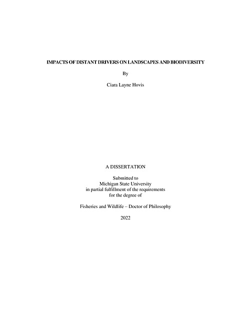 Global biodiversity is increasingly impacted by distant drivers. With societies more connected than ever before, natural resource consumption has expanded beyond administrative and political boundaries. International food trade in particular has profound impacts on land-use and socioeconomic and environmental outcomes. At the same time, global biodiversity is threatened at an unprecedented scale, with many of the causes obfuscated by complexities of distant, interacting socioecological systems. Understanding the ultimate drivers of biodiversity change and translating them to local biodiversity outcomes is integral to addressing conservation challenges in the age of globalization. This dissertation analyzes the impacts of international trade on biodiversity in an agroecosystem undergoing land-use change driven by global markets. Chapter 1 provides background on the study region, Heilongjiang Province, and describes disruption of soybean production in the area due to changes in global trade. Chapter 2 is a systematic review of studies on distant drivers of biodiversity change. Across all taxa, harmful impacts on biodiversity were the most frequent outcome reported, with distant impacts of trade and tourism most frequently studied. In Chapter 3, satellite imagery was classified into landcover classes to create high-fidelity maps of the agriculture-dominated study landscape. By utilizing phenological, synthetic aperture radar, and vegetation/soil index data, accuracies of 91%- 80% were achieved. In Chapter 4 these landcover maps were used to calculate landscape metrics. These metrics were then used to analyze relationships between landscape structure (i.e., composition and configuration) and bird communities. Functional biodiversity indices derived from life history and morphological traits were examined in addition to taxonomic measures. Though no discernable differences between taxonomic and functional community metrics were observed, several significant relationships between landscape structure and biodiversity metrics were found. Crop diversity, natural landcover, and edge metrics, were positively correlated with bird richness. Aggregation of patches, corn area, and soybean area were negatively correlated. We also compared landscape structure and biodiversity between two regions impacted by global soybean trade. Despite the more impacted region having lower crop diversity and natural area, there was no difference in biodiversity between the two regions. The more impacted region also had more rice area, demonstrating that negative biodiversity impacts may be mitigated by rice cultivation. Chapter 5 built on the previous chapter by modeling bird occupancy to assess species-specific relationships with landscape structure. Results indicated that increased crop diversity significantly increased occupancy of birds at both the taxonomic and functional level, particularly for birds belonging to less common functional groups. Percentage of natural area was not as important as expected, while metrics related to landscape configuration had very few significant impacts on occupancy. Increases in rice area were not as detrimental to bird occupancy as increases in corn and soybean. In fact, soybean area exhibited more significant negative relationships with bird occurrence than corn, suggesting that decreases in soybean area due to global trade may have benefitted bird biodiversity in the case of a monocultural landscape. However, due to the prevalence of small-scale farming practices, the more likely outcome would be a decrease in crop diversity due to soybean fields being converted to more profitable crops (e.g., corn, rice). By linking global trade, changes in landcover/use, landscape structure, and local bird communities in the same context, the results of this dissertation highlight the need for integrated biodiversity studies that place ecosystems in the broader context of globalization.