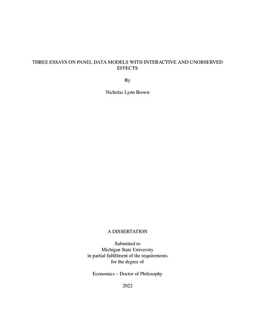 Chapter 1: More Efficient Estimation of Multiplicative Panel Data Models in the Presence of Serial Correlation (with Jeffrey Wooldridge)We provide a systematic approach in obtaining an estimator asymptotically more efficient than the popular fixed effects Poisson (FEP) estimator for panel data models with multiplicative heterogeneity in the conditional mean. In particular, we derive the optimal instrumental variables under appealing `working' second moment assumptions that allow underdispersion, overdispersion, and general patterns of serial correlation. Because parameters in the optimal instruments must be estimated, we argue for combining our new moment conditions with those that define the FEP estimator to obtain a generalized method of moments (GMM) estimator no less efficient than the FEP estimator and the estimator using the new instruments. A simulation study shows that the GMM estimator behaves well in terms of bias, and it often delivers nontrivial efficiency gains -- even when the working second-moment assumptions fail. Chapter 2: Information equivalence among transformations of semiparametric nonlinear panel data modelsI consider transformations of nonlinear semiparametric mean functions which yield moment conditions for estimation. Such transformations are said to be information equivalent if they yield the same asymptotic efficiency bound. I first derive a unified theory of algebraic equivalence for moment conditions created by a given linear transformation. The main equivalence result states that under standard regularity conditions, transformations which create conditional moment restrictions in a given empirical setting need only to have an equal rank to reach the same efficiency bound. Example applications are considered, including nonlinear models with multiplicative heterogeneity and linear models with arbitrary unobserved factor structures. Chapter 3: Moment-based Estimation of Linear Panel Data Models with Factor-augmented ErrorsI consider linear panel data models with unobserved factor structures when the number of time periods is small relative to the number of cross-sectional units. I examine two popular methods of estimation: the first eliminates the factors with a parameterized quasi-long-differencing (QLD) transformation. The other, referred to as common correlated effects (CCE), uses the cross-sectional averages of the independent and response variables to project out the space spanned by the factors. I show that the classical CCE assumptions imply unused moment conditions which can be exploited by the QLD transformation to derive new linear estimators which weaken identifying assumptions and have desirable theoretical properties. I prove asymptotic normality of the linear QLD estimators under a heterogeneous slope model which allows for a tradeoff between identifying conditions. These estimators do not require the number of cross-sectional variables to be less than T-1, a strong restriction in fixed-$T$ CCE analysis. Finally, I investigate the effects of per-student expenditure on standardized test performance using data from the state of Michigan.