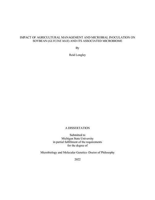 Soybean (Glycine max) is a globally important crop with uses as food, cooking oil livestock feed, and biodiesel. Soybean can be considered holobionts because they host diverse microbiomes which extend plant genotypes and phenotypes through various microbial functions such as nitrogen fixation and increased disease resistance. My research focused on assessing the impact of three agricultural management strategies on the soybean holobiont.Soybean cropping systems can be managed using various strategies, including conventional tillage, no-till, and organic management regimes. These management systems have been shown to impact the microbiomes of soybean-associated soils, however, their impacts on plant-associated microbiomes are still not well understood. In this study, I assessed the impact of conventional, no-till, and organic management treatments on soybean microbiomes at Michigan State's Kellogg Biological Station Long-Term Ecological Research site (KBS LTER). I found that management impacted microbiome composition and diversity in soil, roots, stems, and leaves and that this impact persisted throughout the season. Additionally, when comparing the same soybean genotype grown in conventional and no-till management systems, tillage regime impacted the microbiome throughout the plant and the growing season. This effect impacted microbial taxa which are likely to be plant beneficial, including nitrogen fixing Bradyrhizobium.Another important management tool that is expected to impact plant-associated microbial communities is the application of foliar fungicides. While fungicides are known to protect plants from particular fungal pathogens, non-target impacts of fungicides on crop microbiomes, and the impact of management on microbiome recovery are not well understood. To address this knowledge gap, I assessed the impact of foliar fungicide application on the maize (Headline℗ʼ fungicide, 2017) and soybean (Delaro℗ʼ fungicide, 2018) microbiomes in conventional and no-till plots at the KBS LTER. I found that fungicide applications have a non-target impact on Tremellomycete yeasts in the phyllosphere and this impact was greater in soybean than maize. Co-occurrence network analysis and random forest modelling indicated that changes in fungal communities may lead to indirect impacts on prokaryotic communities in the phyllosphere. Importantly, this work demonstrated that phyllosphere communities of soybeans under no-till management had greater recovery from fungicide disturbance. This novel finding exemplifies how tillage regime can impact phyllosphere microbiomes and their responses to disturbance.Microbial inoculants in agriculture have long been used for biocontrol of pathogens, but there is also interest in their use to dampen the impacts of abiotic stress including drought. In this study, I tested whether inoculating soybeans with hub taxa identified through network analysis from no-till soybean root microbiome data from the KBS LTER could provide protection against water limitation. Soybean seedlings were enriched in consortia of hub bacteria and fungi and were grown in no-till field soil. Seedlings were then exposed to low-moisture stress, and plant phenotypes, plant gene expression, and amplicon sequencing of microbial DNA and cDNA were assessed throughout the stress period. Inoculation increased plant growth, nodule numbers, and led to increased expression of nodulation-associated genes. 16S sequencing of cDNA revealed higher levels Bradyrhizobium in inoculated samples. These results indicate that inoculation with hub microbes can benefit soybean plants, possibly through interaction with other microbes, interaction with the plant, or both. In summary, fungicide, tillage, and inoculation all impact the soybean microbiome, indicating that management choices impact the entire holobiont.