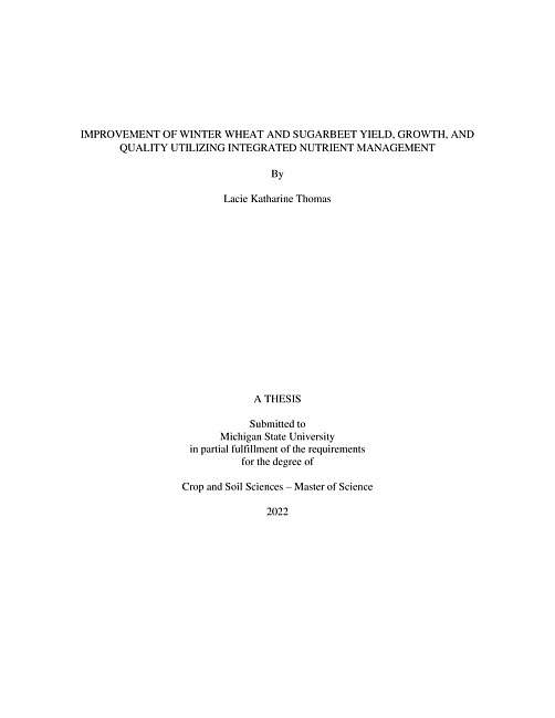 The overwintering success of winter wheat (Triticum aestivum L.) along with heightened awareness of soil spatial variabilities have growers focusing more on season-long soil nutrient availability. Field trials were initiated in Richville and Lansing, MI to evaluate the effects of autumn starter, spring nitrogen (N), and varietal stature on winter wheat plant growth, grain yield, and expected net return. Application of autumn starter (i.e., mid and high treatments compared to no autumn starter) increased grain and straw yield in all site years. Autumn starter and spring N applications indicate above-recommended spring N did not compensate for the lack of autumn-applied starter during establishment. Mid-rate autumn starter was the most economical option under the current environmental conditions to maximize grain and straw yield in soft red and white winter wheat. When fertilizing for straw production, varieties may respond to greater rates of autumn starter, but yield increases did not result in increased profitability. One of the more severe foliar pathogens capable of causing damage to sugarbeet is Cercospora beticola, the causal pathogen of Cercospora leaf spot (CLS). When not managed appropriately, CLS can reduce sugarbeet yield 40%. Management strategies including boron (B)-containing compounds have shown to have fungistatic properties with the ability to reduce disease severity in the field. Field studies were established to investigate the effects of foliar applied B on sugarbeet plant health and CLS disease severity. Application of foliar B did not reduce CLS in field environments across site years. Complementary in vitro studies were conducted to test B effects on C. beticola mycelial growth. Cercospora beticola EC50 values were 772-876 mg kg-1 for sodium tetraborate. Reduced control options, increased CLS resistance, and increase B requirement of sugarbeet enhance the need for further evaluation of alternative control. In-field evaluation of various B timing, increased B concentration, and addition of B-containing compounds may contribute to future CLS control.
