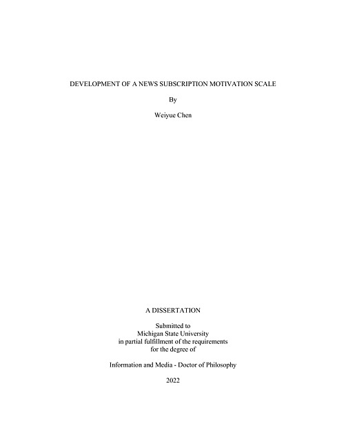 As news organizations face accelerated loss in advertising revenue, increasing importance is placed on strategies to increase subscription sales. Although previous studies have found several predictors of paywall, willingness to pay, and paying for news research, these factors did not fit into one clear conceptual framework that links them together. In this dissertation, I aim to introduce a new construct, News Subscription Motivation, that provides theoretical linkages between different predictors of paying for news. Mixed method research was employed to conceptualize and operationalize this new construct. In Chapter 1, I discuss my thought process developing this study, the purpose of the study, and why this topic matters in the context of digital economy. Chapter 2 includes a review of previous research on what drives people to pay for news, and the literature on consumer decision-making processes, consumer decision-making styles, and consumer motivation in general. The need to develop a new construct and measurement tools that are specially designed for news consumption was also addressed. In Chapter 3, I conducted 22 in-depth interviews to generate possible dimensions of the construct, analyzed the qualitative data to propose a conceptual framework and definition. Study 1 results suggested nine possible dimensions: content utility, journalism quality, price, convenience, hitting the paywall, surveillance, being a good citizen, brand reputation, and journalism. Conceptual definitions of each dimension were also elaborated. Chapter 4 focuses on the operationalization of News Subscription Motivation. An initial items pool was generated based on Study 1. After the pilot test, I recruited two independent samples, and they were respectively subjected to Exploratory Factor Analysis and Confirmatory Factor Analysis. The final scale included six dimensions with 19 items, and this scale demonstrated robust model fit and adequate convergent and discriminant validity. Six dimensions of News Subscription Motivation were identified: supporting journalism, journalism quality, triggered by the paywall, community attachment, price, and content utility. In Chapter 5, I aim to establish the nomological validity of News Subscription Motivation. Factors extracted from Chapter 4 demonstrated statistically significant relationships with numbers of news subscription people report paying for, types of subscriptions people get, and individuals' intention to maintain their primary subscriptions in the next 3 months, 6 months, and 12 months. Finally, I discuss the theoretical and practical implications of the scale of News Subscription Motivation in Chapter 6.