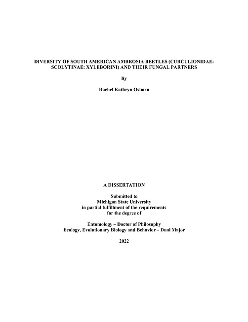 Ambrosia beetles from the tribe Xyleborini (Coleoptera: Curculionidae: Scolytinae) small, haplodiploid beetles that farm nutritional fungi on the walls of tunnels they excavate in the xylem of dead or nearly dead trees. These biological traits make them successful participants in worldwide wooded ecosystems and facilitate their human-mediated invasion beyond their native ranges. A minority of these introduced species are classified as pests because of the physical damage they cause to their plant hosts, or because they vector pathogenic fungi that infect ornamental, lumber, and forest trees. Most of the current knowledge on the diversity of xyleborine beetles and their fungi centers around species found in North America, Asia, and Europe. Little is known about the ambrosia partnerships in the Neotropics, which is concerning because South America is a strong trading partner with the US and the potential for new invasive Xyleborini to be imported from this area is significant. Continuing forest damage caused by invasive Xyleborini/fungi inspires robust research efforts to describe these symbionts and document their biological traits. Considerable efforts are required to enhance such endeavors in underrepresented regions such as South America and Africa. To increase understanding of the South American Xyleborini and their associated fungi, I compiled current knowledge of their historical and contemporary taxonomic records, biological records, and ecological studies. I also completed surveys throughout Ecuador to collect beetles and fungi. Molecular analysis of fungi isolated from Ecuadorian beetles reveals that several Coptoborus species associate with Fusarium fungi, including the ambrosia Fusarium Clade (AFC) that has previously been recovered from Euwallacea spp. and Xyleborus℗ ferrugineus in Central America, Florida, California, Israel, and Asia. Examination of the morphology of some South American xyleborine specimens previously classified as Coptoborus spp. suggests a high similarity to Xyleborus℗ spp. from Africa. Phylogenetic analysis of these South American and African beetles as well as morphological assessment of additional specimens necessitates the designation of a new genus Xenoxylebora gen. nov. containing species endemic to both continents. This unusual distribution demonstrates the ability of these ambrosia beetles to survive long-distance trans-oceanic dispersal.