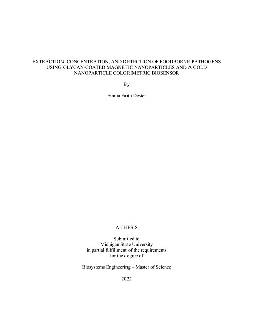 In this work, a rapid method for foodborne pathogen extraction and concentration using magnetic nanoparticles (MNPs) was integrated with a gold nanoparticle (GNP) colorimetric DNA biosensor for fast and accessible detection of target bacteria. Experiments for both extraction and detection were conducted first using pure cultures without interfering food matrix components and followed by testing in food matrices commonly associated foodborne outbreaks. Magnetic concentration was tested with three bacterial species: Listeria spp., Escherichia coli O157, and Staphylococcus aureus. Then, a colorimetric GNP biosensor was developed and tested for E. coli O157. Glycan-coated MNPs are ideal for foodborne pathogen concentration due to their low cost, simple storage conditions, and bacteria binding capabilities. Meanwhile, GNPs visibly change color upon aggregation, which allows for easy use in colorimetric biosensors without the need for expensive analytical equipment. Results from this study indicate concentration of bacteria to up to 60 times its initial concentration in buffer solution and 11 times in select food matrices. In addition, the colorimetric biosensor was capable of differentiating between target and non-target DNA from pure cultures at concentrations as low as 2.5 ng/ÎơL. Finally, the integrated extraction and detection assay was capable of detecting E. coli O157 from contaminated flour. This assay shows immense promise for rapid foodborne pathogen detection, and evidence-based recommendations for continued optimization have also been identified.