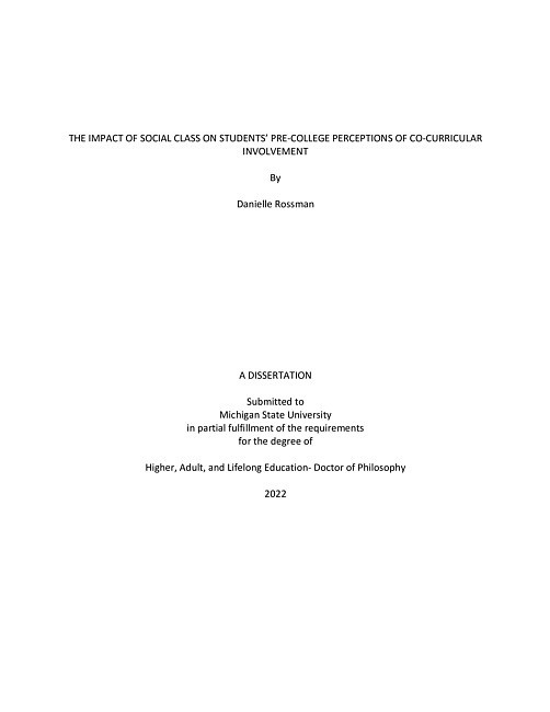 This dissertation uses a cross sectional quantitative design to investigate the relationship between first-year college students' social class and their pre-college interest in engaging in co-curricular experiences during college, their motivations for engaging in co-curricular experiences, and their perceptions of whether co-curricular activities will teach them leadership and work ethic skills. The study also investigated multiple variables to address social class- including metrics of subjective social status and socioeconomic status. The study used data from two surveys that were administered to a sample (N = 839) of first-year, first-time college students from a regional comprehensive university prior to their matriculation. The findings of this study indicate that students' awareness of their socioeconomic status was the only significant predictor of their interest in getting involved in co-curricular activities during college. Students' perceived family contribution to their college education significantly predicted their interest in working during college, while social class had no impact on a student's interest in joining fraternity and sorority life or in student government association. There was a significant relationship between a student's race, gender, and high school extracurricular experiences and their motivation for engagement. A student's Expected Family Contribution was not a significant predictor of the student's interest, motivation, or perception related to involvement.Students' awareness of their socioeconomic status also impacted their perceptions that they could learn leadership skills and work ethic from co-curricular activities, while students with higher subjective social class were more likely to believe they could learn leadership skills from being a participant or member in co-curricular experiences. Implications of these findings for research, theory and practice are offered.More research is needed that explores the impact of social class, and incorporates multiple diverse metrics of social class, on students' college experience. Studies that investigate the ability of on-campus employment to serve as a high impact proactive for students who may not otherwise have the ability to participate in co-curricular experiences on campus are also needed.