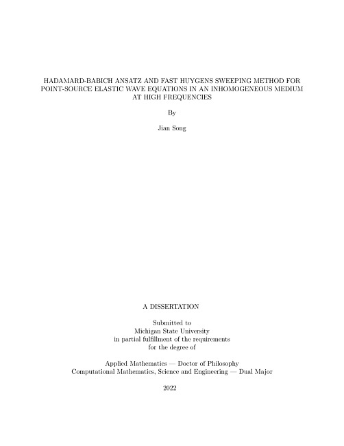 Asymtotic methods are efficient for solving wave equations in the high frequency regime. In the thesis, we first develop a new asymptotic ansatz for point source elastic wave equations in an inhomogeneous medium. Then, we propose a fast Huygens sweeping method to construct a globally valid Green's functions in the presence of caustics. Finally, an Eulerian partial-differential-equation method is proposed to compute complex-valued eikonals in attenuating media.In Chapter 3, we develop the Hadamard-Babich (H-B) ansatz for frequency-domain point source elastic wave equations in an inhomogeneous medium in the high-frequency regime. First, we develop a novel asymptotic series, dubbed Hadamard's ansatz, to form the fundamental solution of the Cauchy problem for the time-domain point-source (TDPS) elastic wave equations in the region close to the source. Then, the governing equations for the unknown asymptotics of the ansatz are derived including the traveltime functions and dyadic coefficients. A matching condition is proposed to initialize the data of unknowns at the source. To treat singularity of dyadic coefficients at the source, smoother dyadic coefficients are then introduced. Directly taking the Fourier transform of Hadamard's ansatz in time, we obtain the H-B ansatz for the frequency-domain point-source (FDPS) elastic wave equations. To verify the feasibility of the new ansatz, we truncate the ansatz to keep only the first two terms to compute the resulting asymptotic solutions. Numerical examples demonstrate the accuracy of our method.In Chapter 4, we propose a new truncated Hadamard-Babich ansatz based globally valid asymptotic method, dubbed the fast Huygens sweeping method, for computing Green's functions of FDPS elastic wave equations in inhomogeneous media in the high-frequency regime and in the presence of caustics. The first novelty of the fast Huygens sweeping method is that the Huygens-Kirchhoff secondary-source principle is used to integrate many locally valid asymptotic solutions to yield a globally valid asymptotic solution so that caustics can be treated automatically and implicitly. The precomputed asymptotic ingredients can be used to construct Green's functions of elastic wave equations for many different point sources and for arbitrary frequencies. The second novelty is that a butterfly algorithm is adapted to accelerate matrix-vector products induced by the discretization of the Huygens-Kirchhoff integral. The computational cost of the butterfly algorithm is O(NlogN) which is in nearly optimal complexity in terms of the total number of mesh points N. The prefactor of the complexity depends only on the specified accuracy and is independent of the frequency parameter. Numerical examples are presented to demonstrate the performance and accuracy of the new method.In Chapter 5, we propose a Eulerian partial-differential-equation method to solve complex-valued eikonals in attenuating media. In the regime of high-frequency asymptotics, a complex-valued eikonal is an essential ingredient for describing wave propagation in attenuating media, where the real and imaginary parts of the eikonal function capture dispersion effects and amplitude attenuation of seismic waves, respectively. Therefore, a unified framework to eulerianize several popular approximate real-space ray-tracing methods for complex-valued eikonals is proposed so that the real and imaginary parts of the eikonal function satisfy the classical real-space eikonal equation and a novel real-space advection equation, respectively, and we dub the resulting method the Eulerian partial-differential-equation method. We further develop highly efficient high-order methods to solve these two equations by using the factorization idea and the Lax-Friedrichs weighted essentially non-oscillatory (WENO) schemes. Numerical examples demonstrate that the proposed method yields highly accurate complex-valued eikonals, analogous to those from ray-tracing methods.