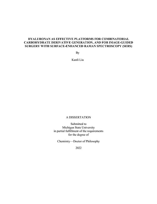 Hyaluronan (HA) is a polysaccharide consisting of repeating disaccharides of N-acetyl-D-glucosamine and D-glucuronic acid. HA plays important roles in a wide range of biological events. The principal endogenous receptor of HA, cluster of differentiation 44 (CD44), is overexpressed on many types of tumor cells as well as inflammatory cells in human bodies. HA-CD44 interactions are important in cell adhesion, cell migration, induction of hematopoietic differentiation, and signaling for cell activation. Other HA receptors include lymphatic vessel endothelial HA receptor-1 (LYVE-1), and HA receptor for endocytosis (HARE).HA is versatile for chemical modification or conjugation by exploiting the reactivity of carboxyl group, hydroxyl group, or the reducing end of the HA chain. Through chemical modification of HA, various kinds of self-assembled HA nanoparticles (HA-NPs) can be generated. There are increasing interests in utilizing HA-NPs for targeted imaging and therapy. Active targeting from HA-CD44 mediated interaction could lead to selective accumulation of HA-NPs at targeted disease sites. Chapter 1 is a review focusing on the synthesis strategies of self-assembled HA-NPs, as well as their applications in therapy and biomedical imaging.With the recognition of the importance of HA-CD44 interactions, there have been substantial efforts to develop novel compounds capable of binding with CD44 to modulate CD44 biology. Chapter 2 reports a novel approach for generating HA derivatives with enhanced CD44 binding. By modifying the carboxyl group on HA with various amine, aldehyde, and isocyanide moieties through the Ugi reaction, 36 HA like polysaccharides were generated. Two lead compounds were identified with enhanced CD44 binding from the polysaccharide library compared to unmodified HA, which was confirmed by surface plasmon resonance and cellular studies. Ski-learn as a machine learning tool was utilized to analyze the library of binding data and yield prediction with an accuracy over 80%. In conclusion, modification of HA via the Ugi reaction can be a promising approach to develop novel binders toward CD44.While HA has been frequently employed as the targeting molecule in imaging via near infrared (NIR) or magnetic resonance (MRI) imaging, the potential of HA for surface-enhanced Raman spectroscopy (SERS) imaging has not yet been explored. SERS NPs are well-known for strong multiplexing capability, since different flavors of SERS NPs can be synthesized using different SERS dyes, resonant or non-resonant dye. SERS NPs are a promising tool for tumor margin removal in image-guided surgery. However, there are several challenges associated with SERS NPs for cancer imaging: 1) reproducible synthesis of SERS NPs; 2) ligand attachment for SERS NPs. Chapter 3 addresses these two issues by: 1) developing a reproducible protocol for 50 nm SERS NPs with low-femtomolar detection sensitivity; 2) employing liposome as the bridge for HA attachment to SERS NPs. The resulting HA-liposome SERS NPs have been successfully applied in imaging guided surgical removal of breast cancer in a spontaneous mouse breast cancer model.