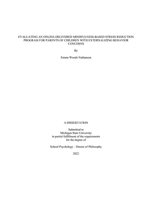 Many parents experience elevated levels of stress, or the perceived inability to cope with one's situational demands. Parents of children with externalizing behavioral concerns tend to experience even higher levels of stress than parents of children without significant behavior concerns due to the transactional and bidirectional nature of child behavior and parent stress. The Family Adjustment and Adaptation Response (FAAR) model suggests that families work to balance demands with capabilities, which interact with family meanings, to achieve adjustment or adaptation. Thus, increasing capabilities is an important task for families experiencing stress. Mindfulness-based stress reduction (MBSR), rooted in mindfulness theory, is an increasingly popular framework for reducing stress, anxiety, and depression. MBSR has been successfully used in many populations including parents to reduce parent stress and even help to improve child outcomes. However, there is a dearth of research on MBSR for parents of children with externalizing behavior concerns. One accessible, research-supported, online-delivered MBSR program is called Be Mindful. Currently, there is no extant research on the effects of this program for parent stress and child behavior outcomes. This hybrid effectiveness-implementation intervention study sought to evaluate the effectiveness of this publicly accessible, online, self-mediated MBSR program (Be Mindful) for reducing parent stress and decreasing child externalizing behavior immediately following completion of the program and at one-month follow-up. Other major aims of the study were to determine whether the online-delivered MBSR intervention was acceptable to parents and to characterize how parents engaged with the MBSR program. Participants included a 38 mothers, fathers, and other primary caretakers of children ages two to ten years with behavioral concerns living across the United States. Children were a community sample presenting with externalizing behavior concerns at or above the at-risk range (raw score ⁹́Æ 115) based on the Eyberg Child Behavior Inventory whose parents had stress levels at or above the 60th percentile on any domain of the Parenting Stress Index, Fourth Edition. Parents engaged in the 4-module Be Mindful (MBSR) program for between 4 and 10 weeks and completed pre-, post-, and follow-up adult stress and child behavior measures. Parents also completed usage and satisfaction reports throughout the study. Results of the study provided promising support for the Be Mindful intervention within this particular population: there were robust, statistically significant and clinically meaningful reductions in both parent stress and externalizing child behavior problems following completion of the intervention that maintained through one-month follow-up. Additionally, participants generally found the intervention to be acceptable and practiced the skills a moderate amount during the intervention phase. Open-ended and quantitative feedback provides information regarding barriers and facilitators to intervention use. These results are important within the context of the global COVID-19 pandemic, provide further support for the increasingly popular MBSR framework in an online format, and uniquely examine effects on both parent stress and child behavior in a real-world sample. Limitations, directions for future research, and implications for practice are discussed.
