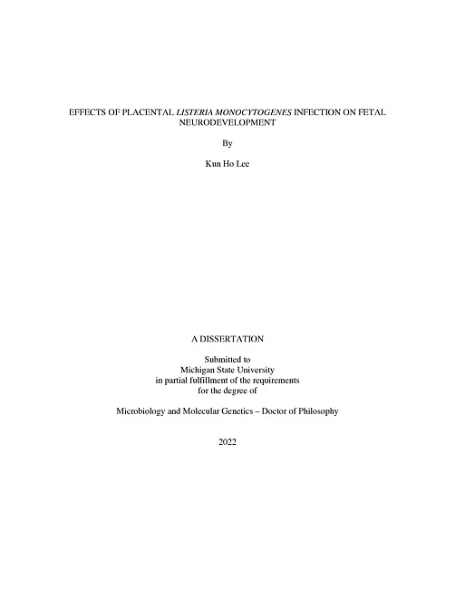 Maternal infection can lead to adverse pregnancy outcomes. Numerous epidemiological studies have demonstrated an association between prenatal infection and neuropsychiatric disorders, including autism spectrum disorder (ASD). Different prenatal infections are associated with distinct neurological pathologies, necessitating studies of the diversity of prenatal pathogens and their consequences. Listeria monocytogenes (Lm) is a foodborne pathogen that causes listeriosis, which typically affects immunocompromised individuals, including pregnant mothers. Prenatal infection with Lm can cause detrimental pregnancy outcomes, such as miscarriages, stillbirths, preterm labor, and death in newborns. However, neurological outcomes of maternal listeriosis have not been characterized. Here, I sought to investigate whether placental infection with Lm is associated with altered neurodevelopment by using a bioluminescence strain of Lm and a murine model of pregnancy-associated listeriosis. I show that placental infection affects neurodevelopment during pregnancy and behavior in the offspring.To investigate how placental infection with Lm dysregulates fetal brain development, I performed RNA-seq on fetal brains to quantify the enrichment of genes that were associated with the infection during gestation. The findings of RNA-seq analysis illustrated that placental infection with Lm altered fetal brain transcriptome and showed sexually dichotomous gene expression profiles. I further assessed the effects of different traits, including Lm exposure, the intensity of placental infection, and sex on the fetal transcriptome using systems biology. The genes weregrouped into co-expression modules. Notably, maternal infection and its intensity measured by bioluminescence imaging signal were significantly associated with specific modules, suggesting these traits are the main factors driving these transcriptional changes. Lastly, I showed that placental Listeria infection enriched ASD-associated genes. These results demonstrate that maternal listeriosis dysregulates fetal brain transcriptome during gestation.Neurodevelopment is a complex process influenced by various environmental factors during pregnancy. To examine whether prenatal infection with Lm affects cortical lamination and neural activity, I performed hematoxylin and eosin staining and immunohistochemistry. Gross anatomy of the brain structure analysis showed that placental infection with Lm affected cortical lamination in a localized manner. Furthermore, increased neural activity was observed in Lm- exposed male offspring. These results illustrate that placental infection with Lm induces morphological changes in brain tissue during neurodevelopment.Behavioral symptoms of neuropsychiatric disorders are an important component of the diagnosis. Animal behavioral assays and tools have been developed to examine animal behavior such as social interactions, anxiety, and repetitive behaviors. I examined behavior tests that resembled ASD to determine if mouse offspring born following placental infection displayed abnormal behavior. Lm-exposed offspring exhibited altered behaviors and showed sex-dependent behavioral changes. Overall, my work highlights the impact of maternal listeriosis on brain development during pregnancy and its effects on offspring's behavior and contributes to the understanding of the spectrum of fetal neurodevelopment.