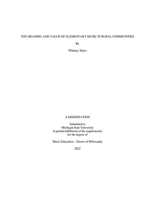 In education policy, research, and reform, rural education spaces are often an afterthought, if included at all (Azano et al., 2021; McShane & Smarick, 2018; Tieken, 2014). Music education research has followed a similar trend, with scholarly efforts directed toward school districts with greater resources or addressing racial equity while excluding rural music programs (Bates, 2011). To bring rural music education into discussions of music education for all, there is a need to understand what rural spaces are and how rural communities and music programs interact. The purpose of this study was to explore the meaning and value of elementary music in rural communities. Specific research questions were: 1) How do students, music teachers, administrators, and caregivers in rural communities view their elementary music programs, and what meanings do these stakeholders construct? 2) In what ways do elementary music teachers connect with and respond to their communities? I designed and completed an instrumental multiple case study (Stake, 1995; Yin, 2018) that included elementary school music programs. Primary participants were rural three elementary music teachers representing different geographic areas of the United States. Additional participants included students in third through fifth grade, elementary administrators, secondary music teachers (where available) and caregivers. I conducted three interviews with each elementary music teacher as well as a week-long residence at each site. I interviewed administrators and secondary music teachers. I conducted focus group sessions with caregivers and students. I generated field notes, thick descriptions, and researcher memos. Throughout design, data collection and analysis, I utilized social constructivism with a focus on meaning making (Charmaz, 2014; Hayes, 2020) as my theoretical framework. I analyzed the data and generated case descriptions, then conducted a cross-case analysis. My cross-case analysis revealed shared and unique values of the elementary music program. Participants highlighted music enjoyment, music as a social connection, and the music teacher and important. I observed several hierarchies being enacted within the school and community impacting the music program, including suburbanormative biases and the subordinate status of elementary music. Music teachers worked to navigate community perceptions of music benefits, such as academic support, emotional regulation, and preparation for secondary ensembles. Participants described the connections their elementary music program created and engaged with place as a locale and a physical location. Based on the findings from each case and my cross-case analysis, I presented several implications for practice and policy, including a closer examination of the definition of musical success, further investigation into the wants and needs of rural elementary music educators, and the importance of soliciting essential voices in music education research.