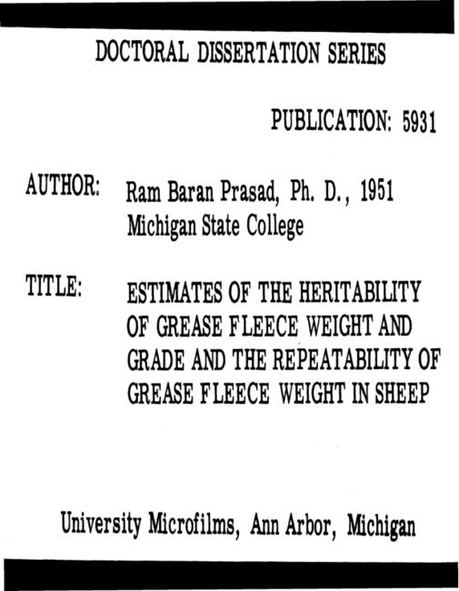 Estimates of the heritabilty of grease fleece weight and grade and the repeatability of grease fleece weight in sheep